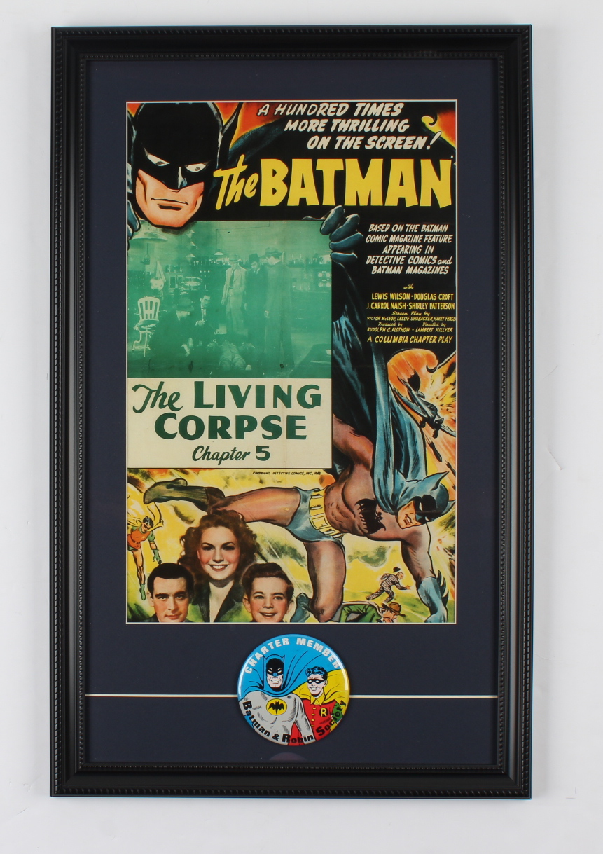 Custom frame measures 15" x 24" in size and features a movie poster from the 1943 Serial "The Batman, Chapter Five: The Living Corpse". The display also includes a 1966 Batman and Robin Society Charter Member novelty pin. Please note, the frame shows signs of handling.