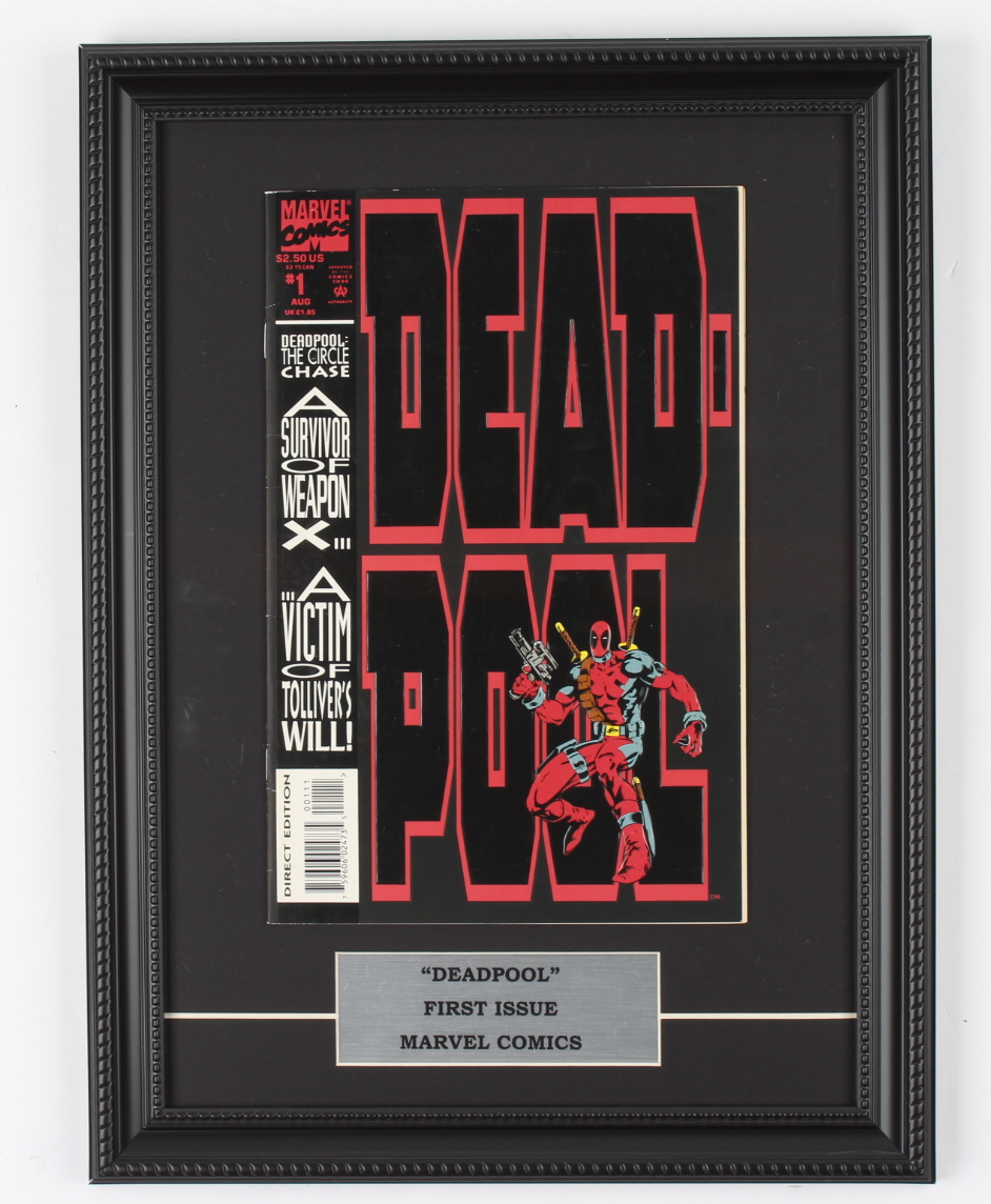 Custom framed measures 12" x 17" in size and features a 1993 "Deadpool" Issue #1 Marvel first issue comic book. Please note, the comic book itself has some minor wear, and the back of the frame has some damage.