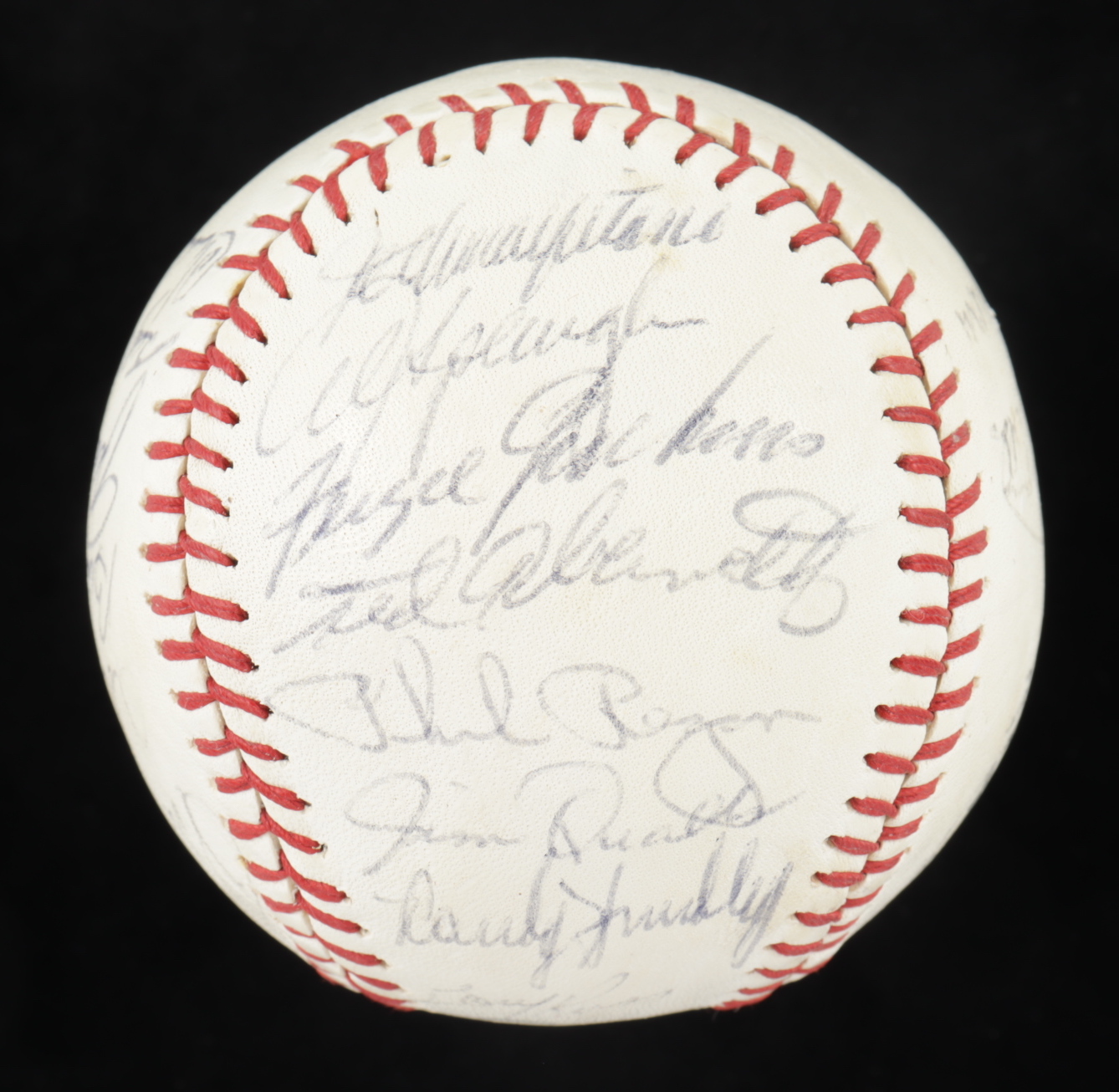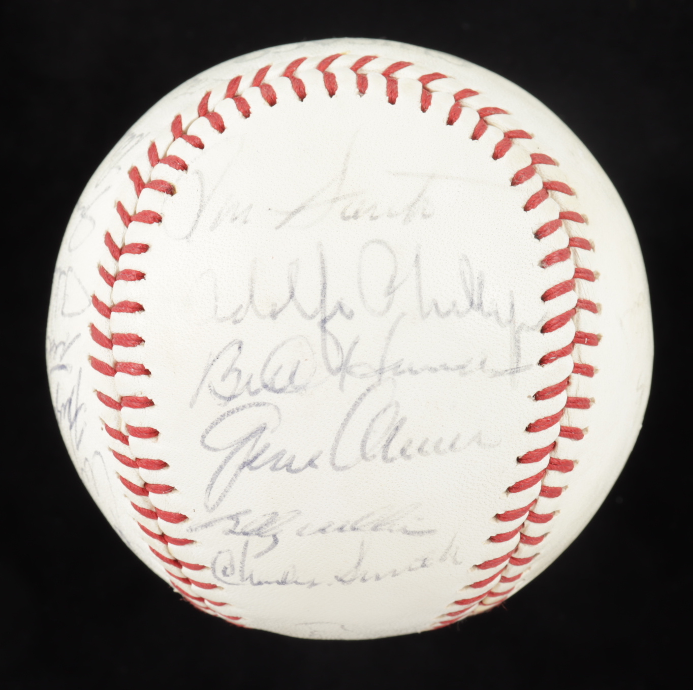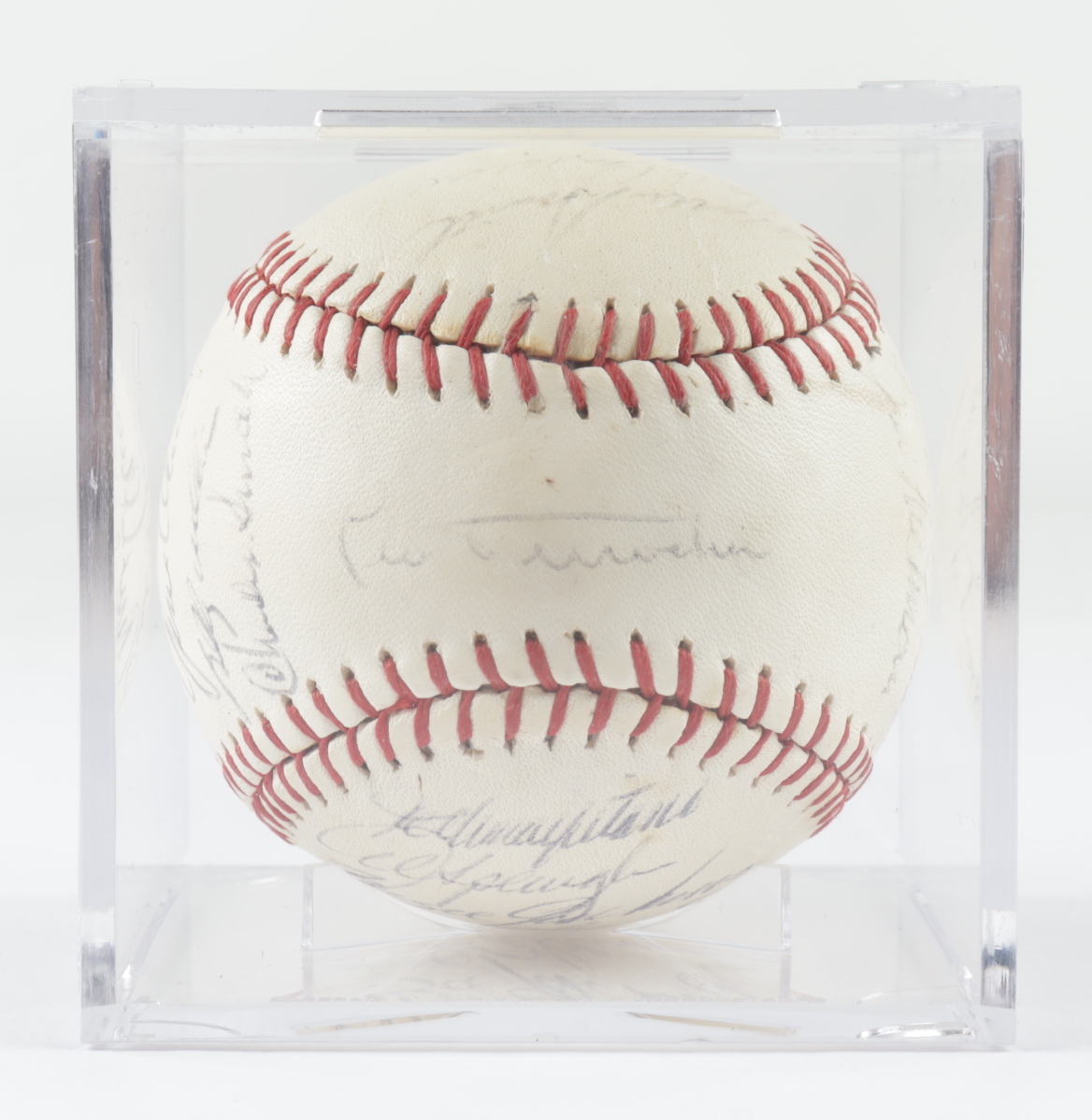 Spalding baseball is hand-signed by (25) including Leo Durocher, Ernie Banks, Ron Santo, Billy Williams, Fergie Jenkins, and (20) others. Please note, the baseball shows signs of natural toning. Includes the display case shown. (Chicago Cubs)