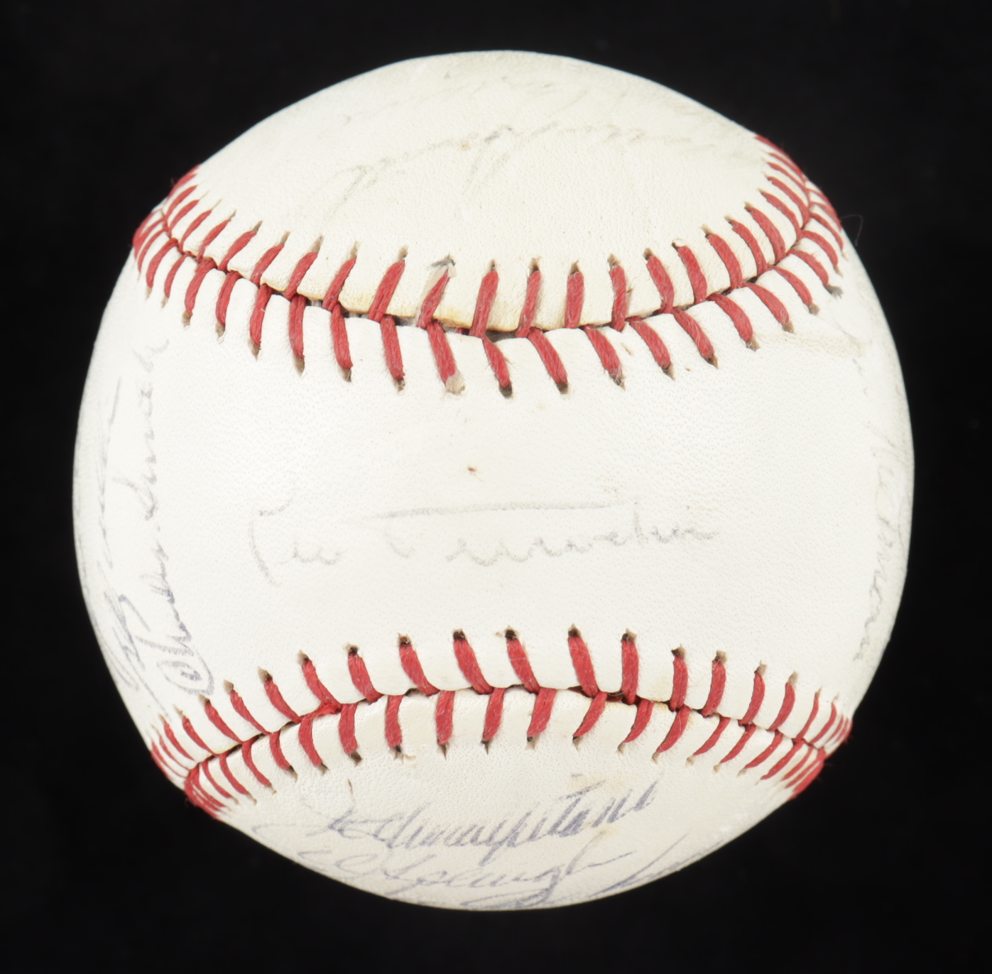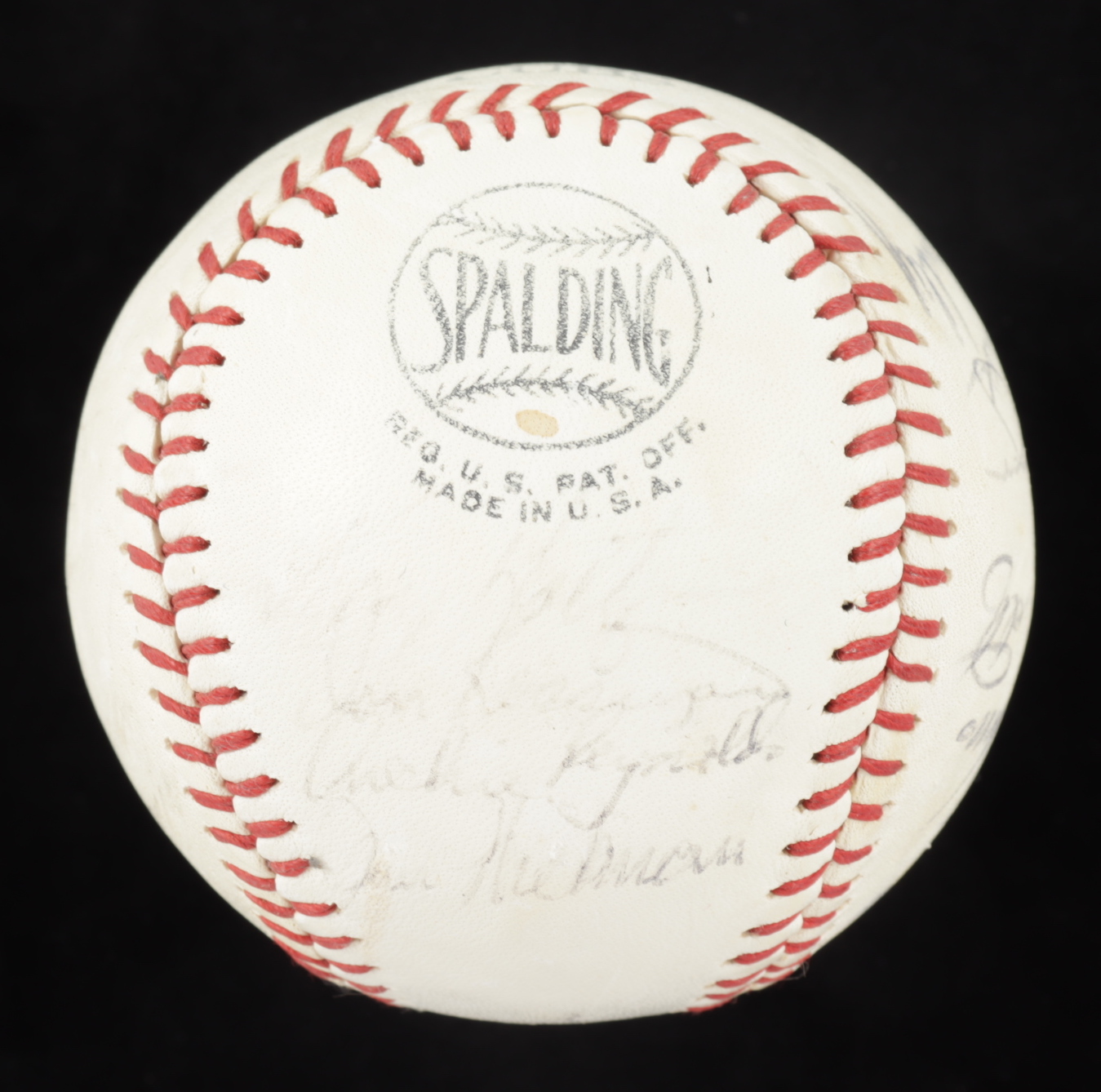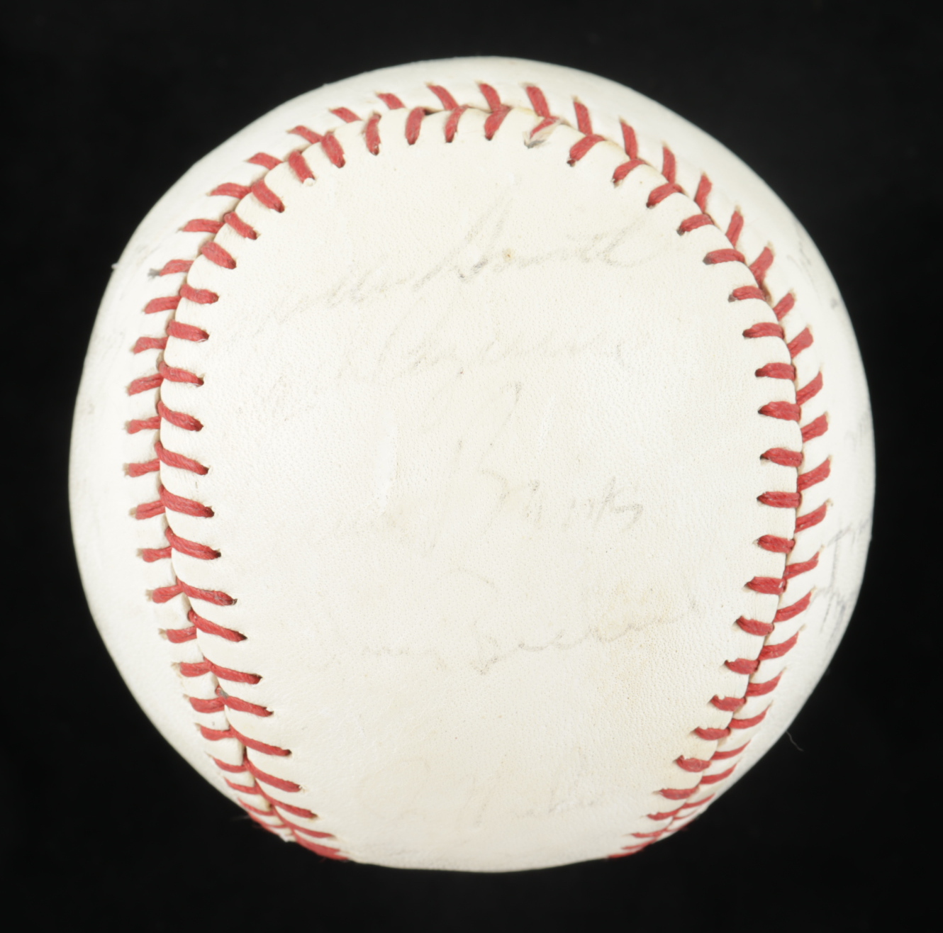 Spalding baseball is hand-signed by (25) including Leo Durocher, Ernie Banks, Ron Santo, Billy Williams, Fergie Jenkins, and (20) others. Please note, the baseball shows signs of natural toning. Includes the display case shown. (Chicago Cubs)
