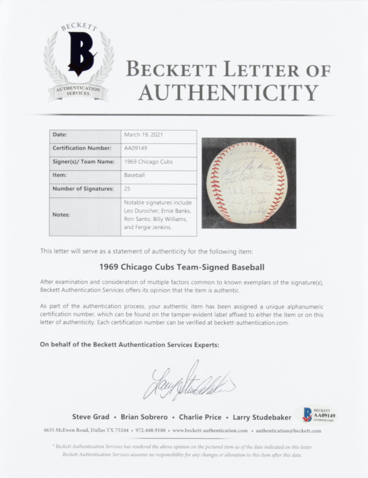 1969 Cubs Baseball Team-Signed by (25) with Leo Durocher, Ernie Banks, Ron Santo, Billy Williams, Fergie Jenkins with Display Case (Beckett LOA & Marshall LOA)