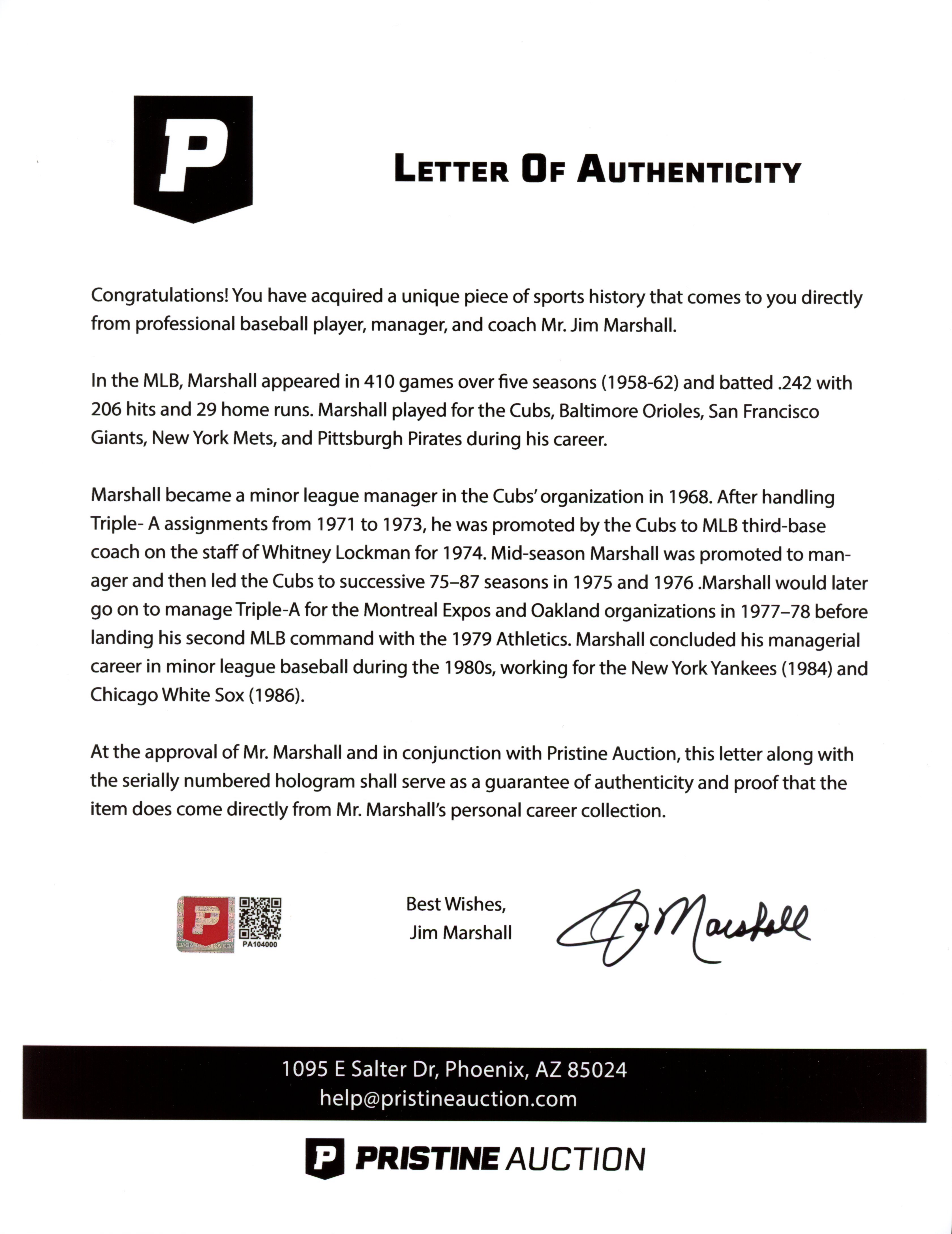 The lot / autograph(s) includes an official Beckett Authentication Services hologram and matching LOA, as well as an official Jim Marshall LOA for authenticity purposes. The lot was part of Jim Marshall's personal career collection. Authentication: Beckett LOA & Marshall LOA