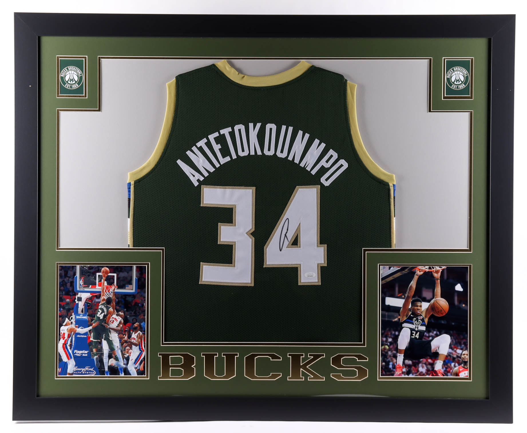 Custom frame measures approximately 35" x 43" in size and features a custom on-court style jersey that has been hand-signed by Giannis Antetokounmpo.