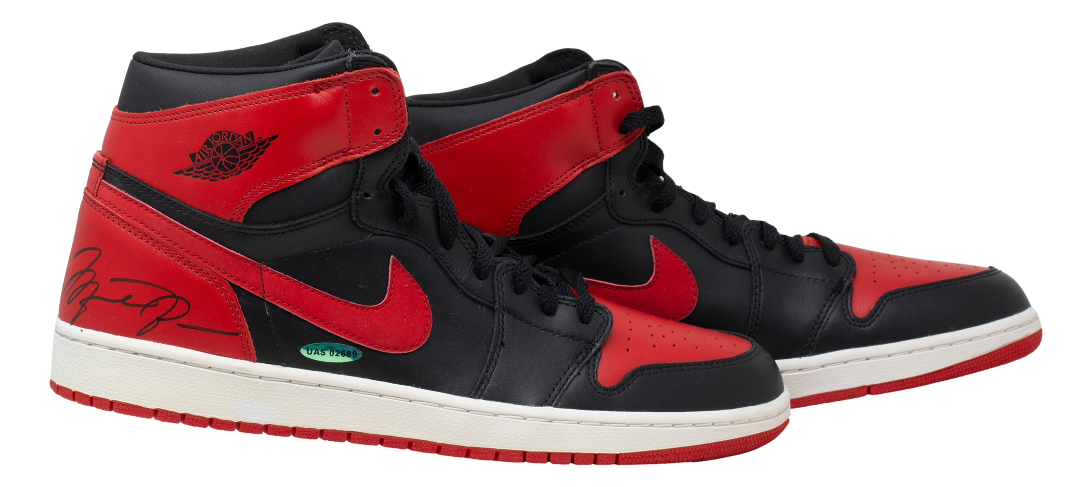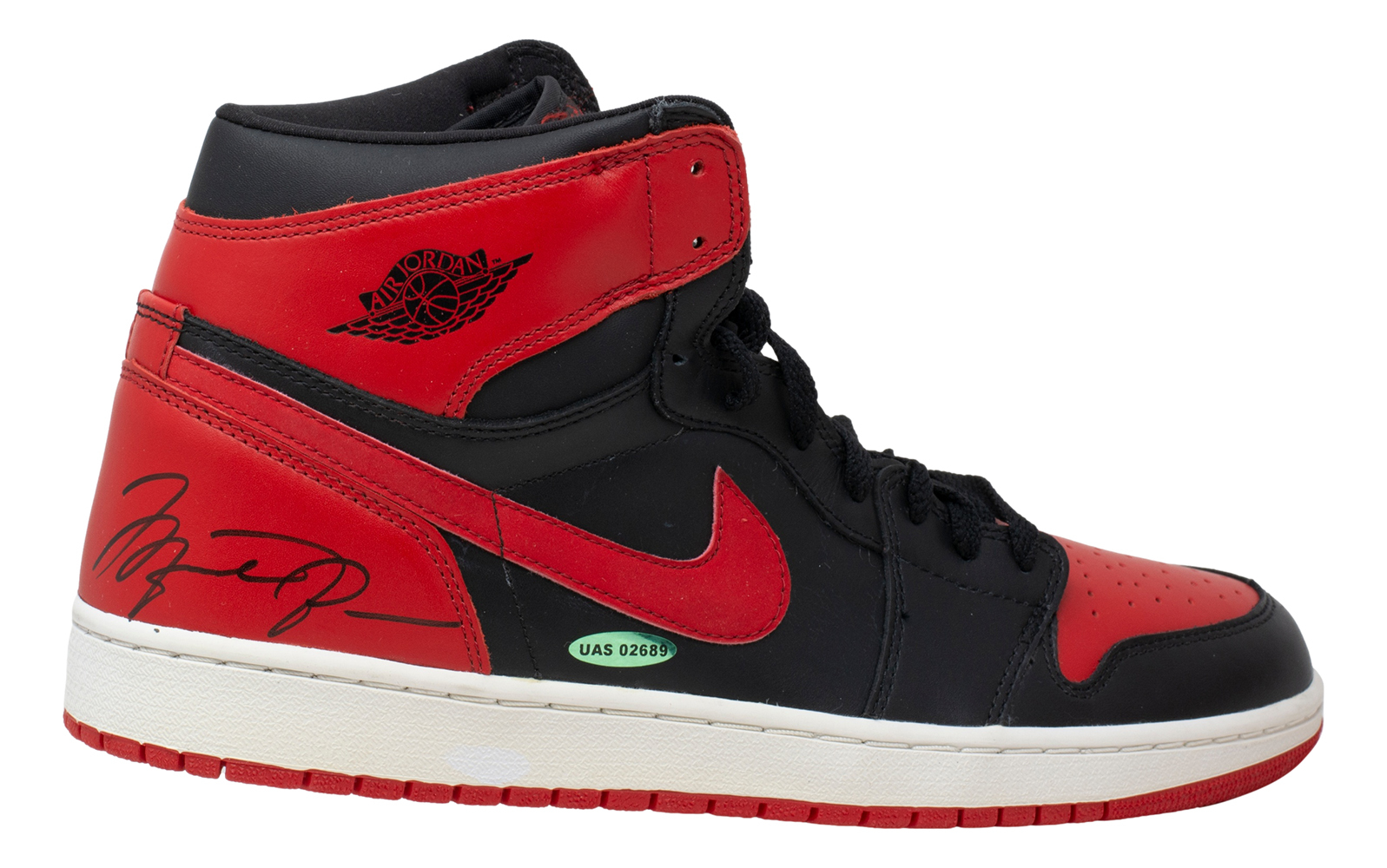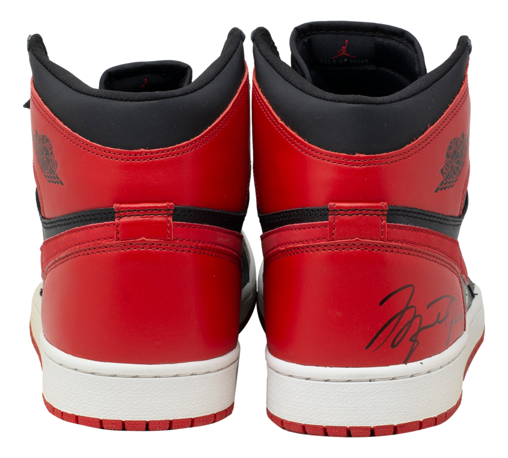 Nike Air Jordan 1 Retro basketball shoes, size 13. Hand-signed by Michael Jordan (Chicago Bulls, HOF).