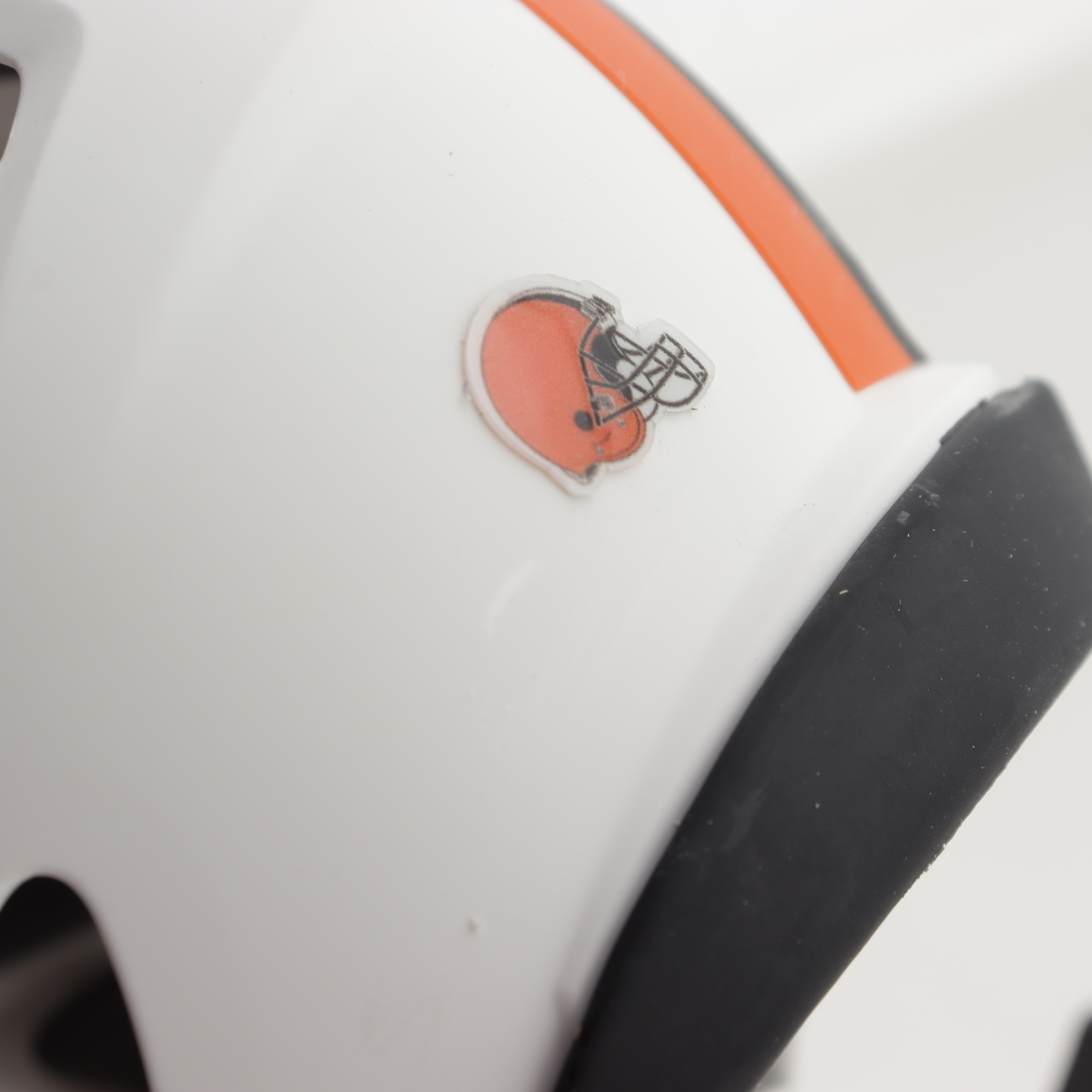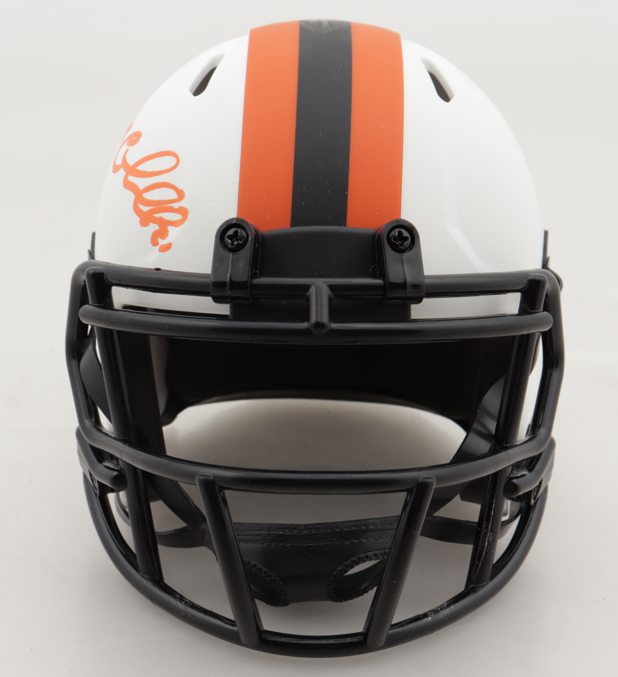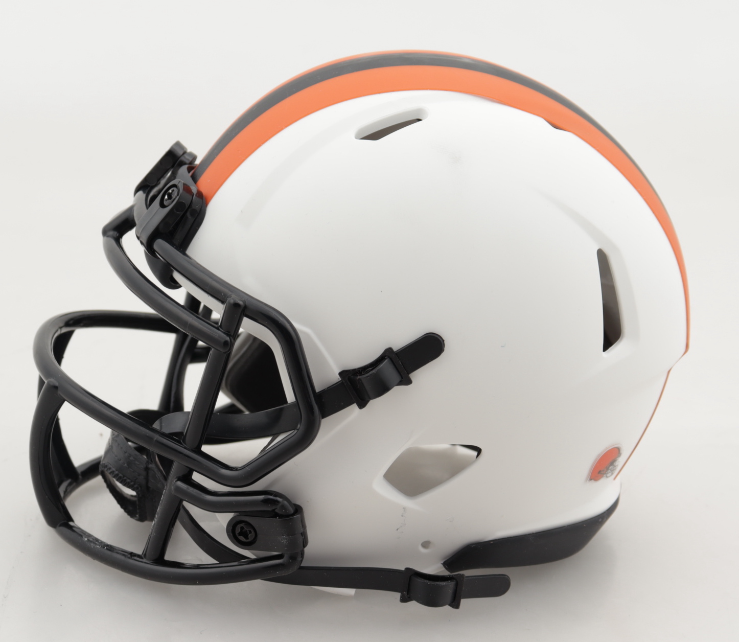 Riddell Cleveland Browns lunar eclipse alternate speed mini helmet. Hand-signed by Nick Chubb. Please note, the helmet shows signs of imperfection.