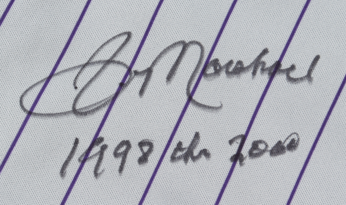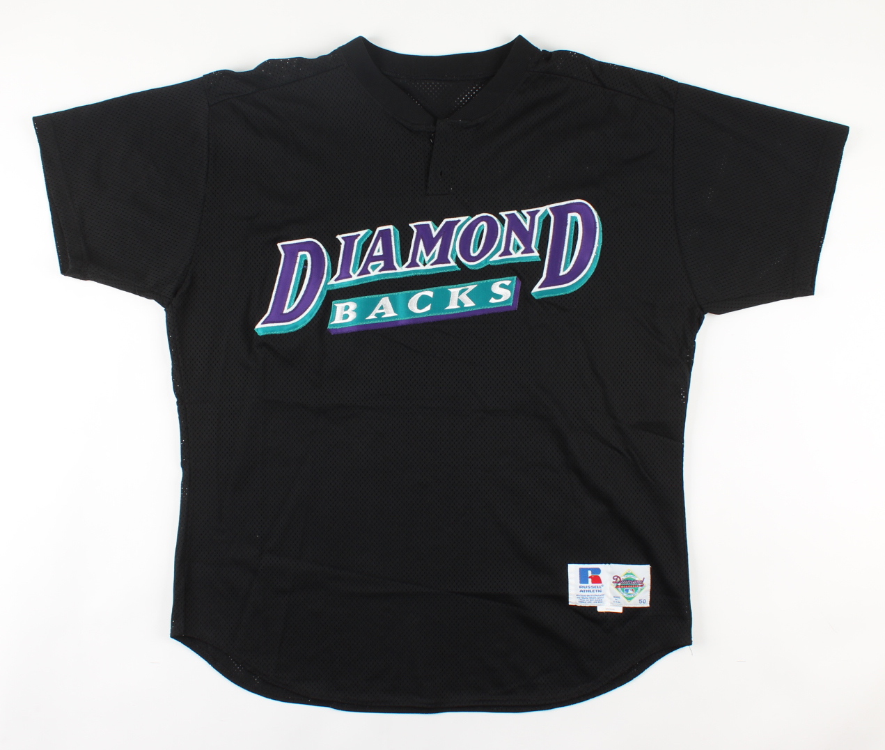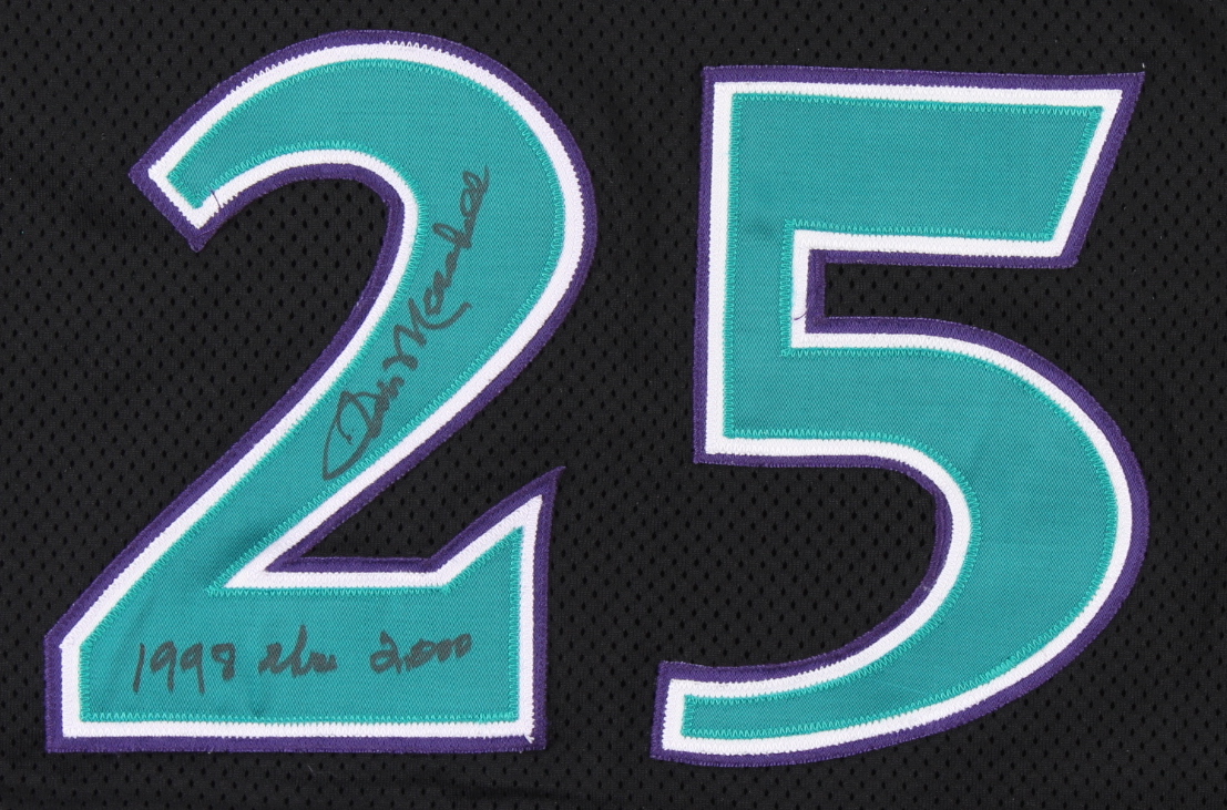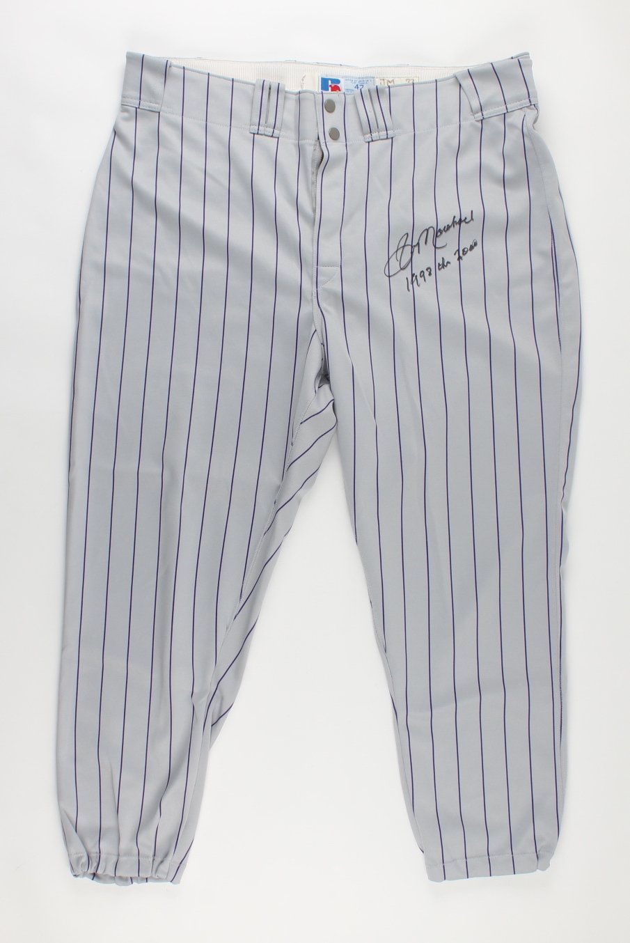 Russell Athletic on-field uniform. Jersey size 50, pants size 42. Both pieces are hand-signed and inscribed by Jim Marshall (Arizona Diamondbacks).