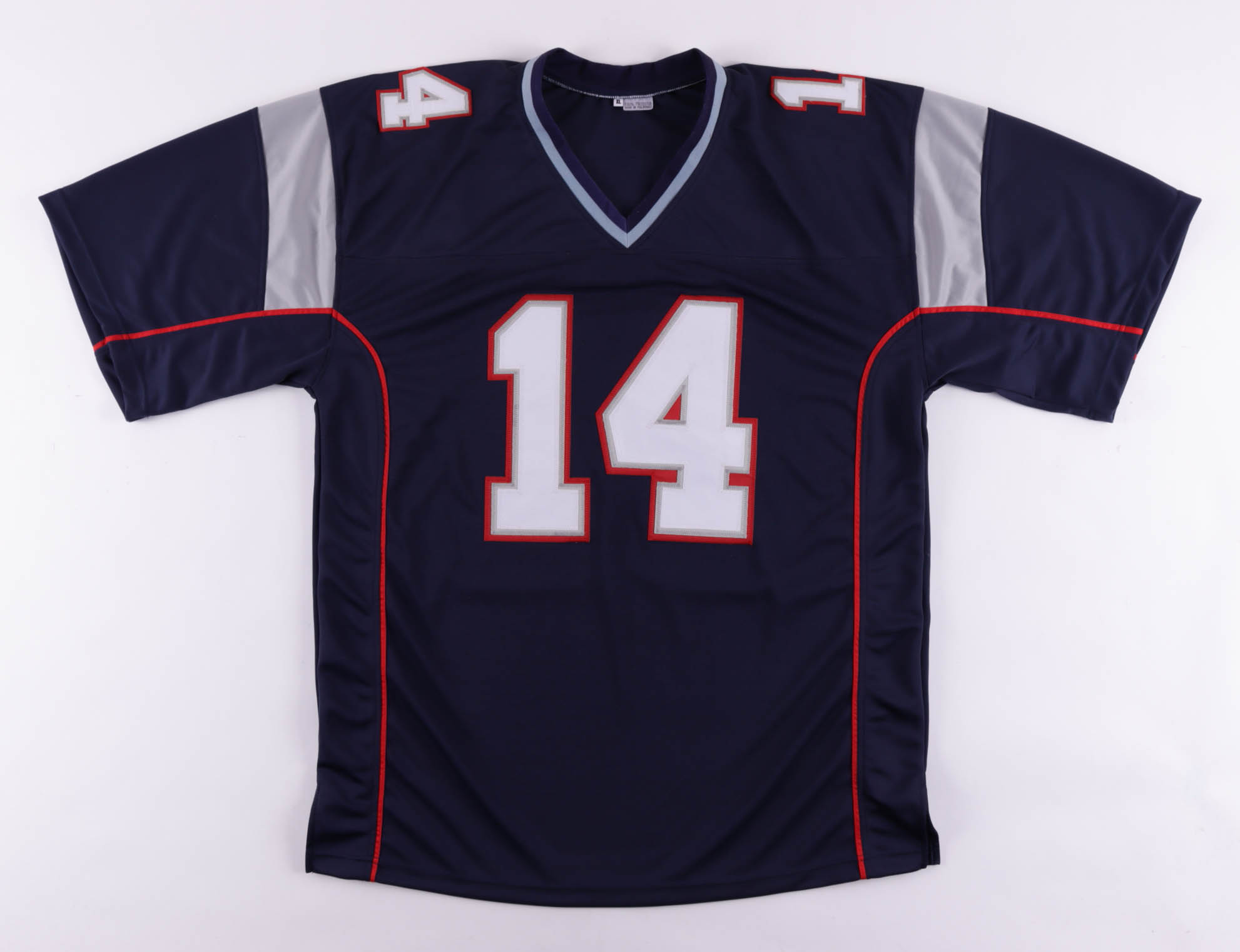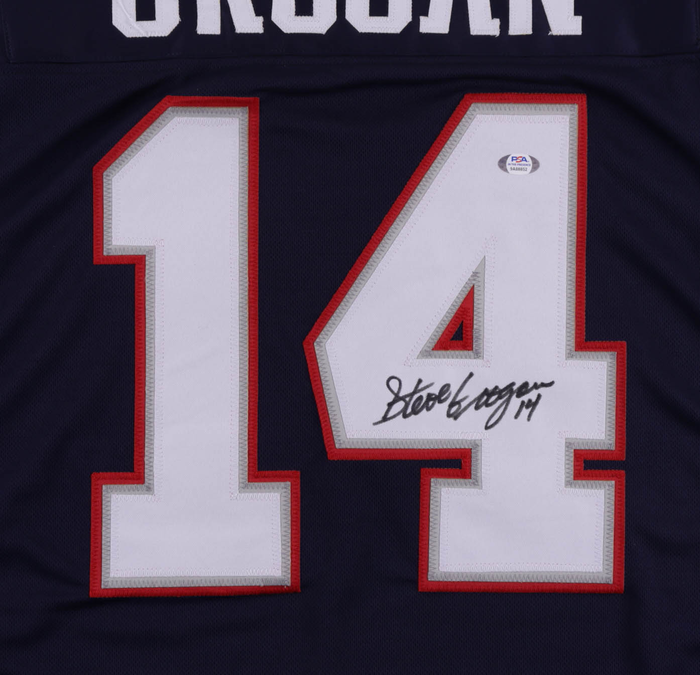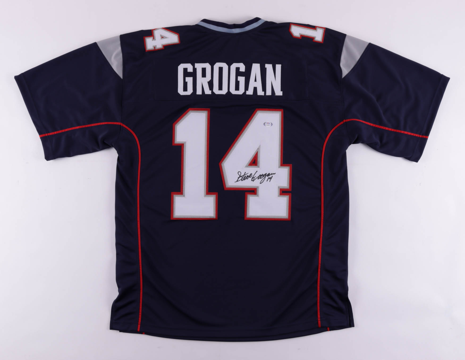 Custom on-field style jersey. Everything is sewn on, size XL. Has been hand-signed by Steve Grogan.