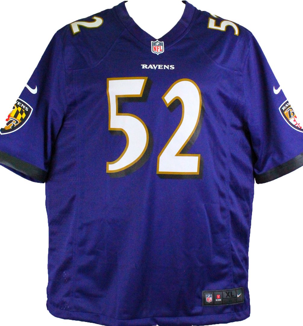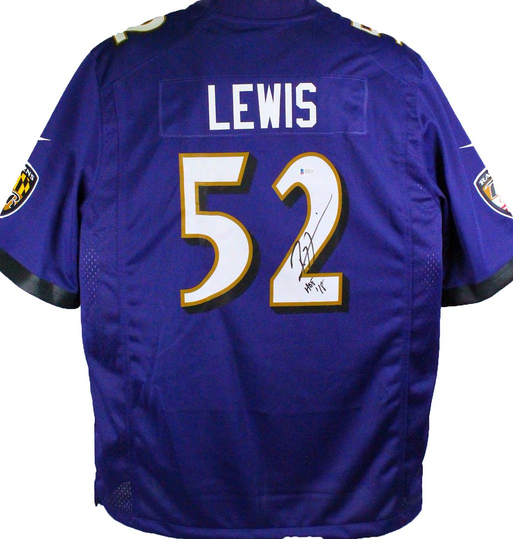 Nike on-field style jersey. Everything is printed on, size XL. Has been hand-signed by Ray Lewis (Baltimore Ravens, HOF).