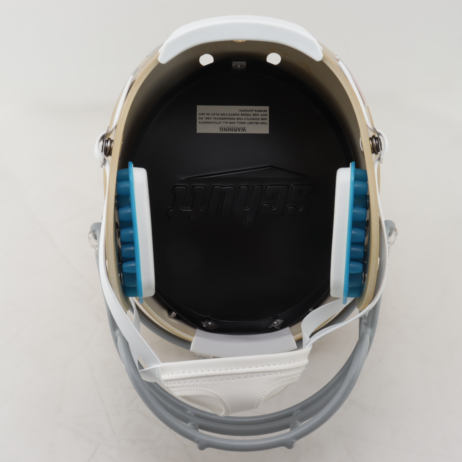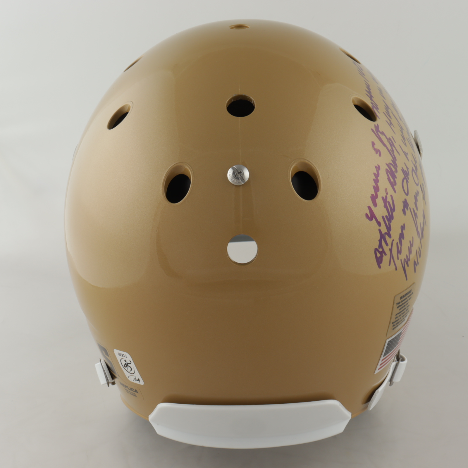Schutt Notre Dame Fighting Irish full-size replica helmet. Has been hand-signed and inscribed by Rudy Ruettiger.