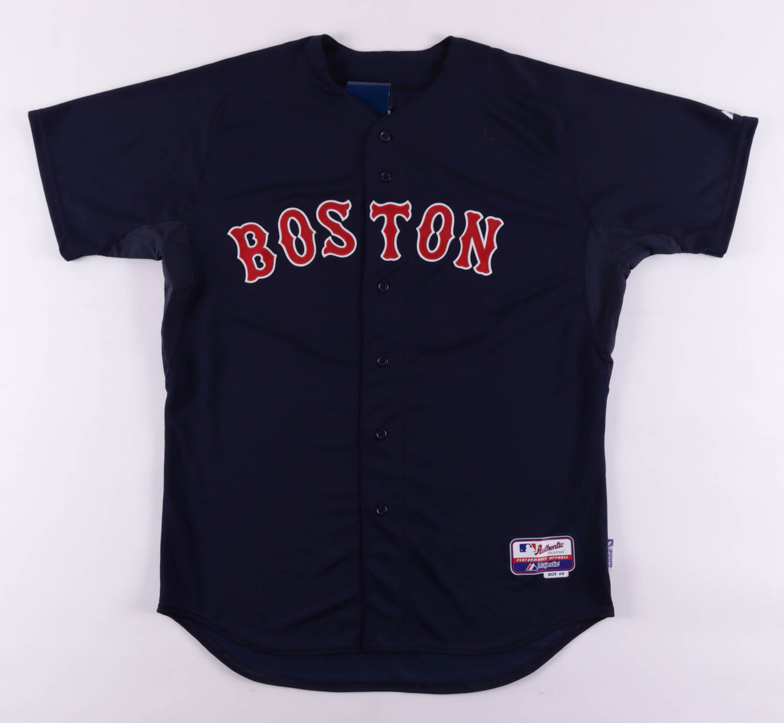 Majestic on-field style jersey. Everything is sewn on, size 48. Has been hand-signed by Jon Lester (Boston Red Sox).