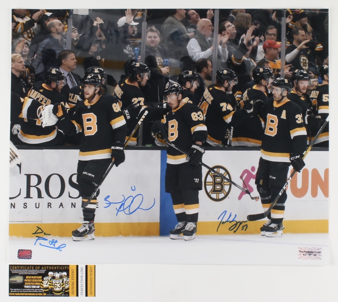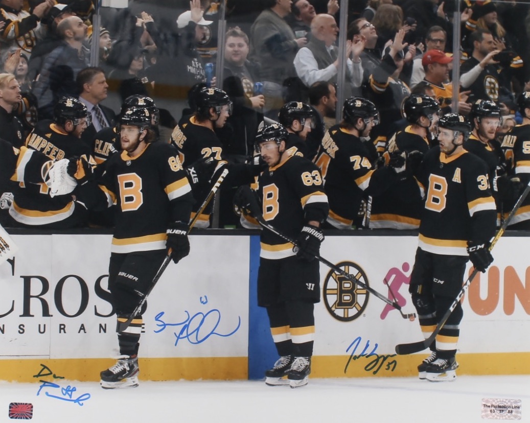 Photo measures 16" x 20" in size and has been hand-signed by Brad Marchand (Boston Bruins), Patrice Bergeron (Boston Bruins) and David Pastrnak (Boston Bruins).