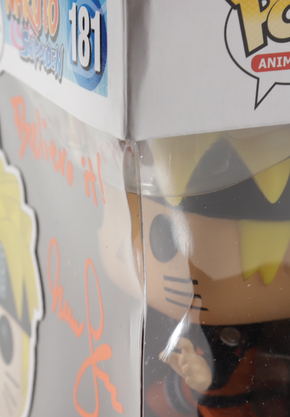 Funko Pop! figure measures approximately 4" tall and has been hand-signed by Maile Flanagan (Naruto Uzumaki). Please note, box shows signs of wear.