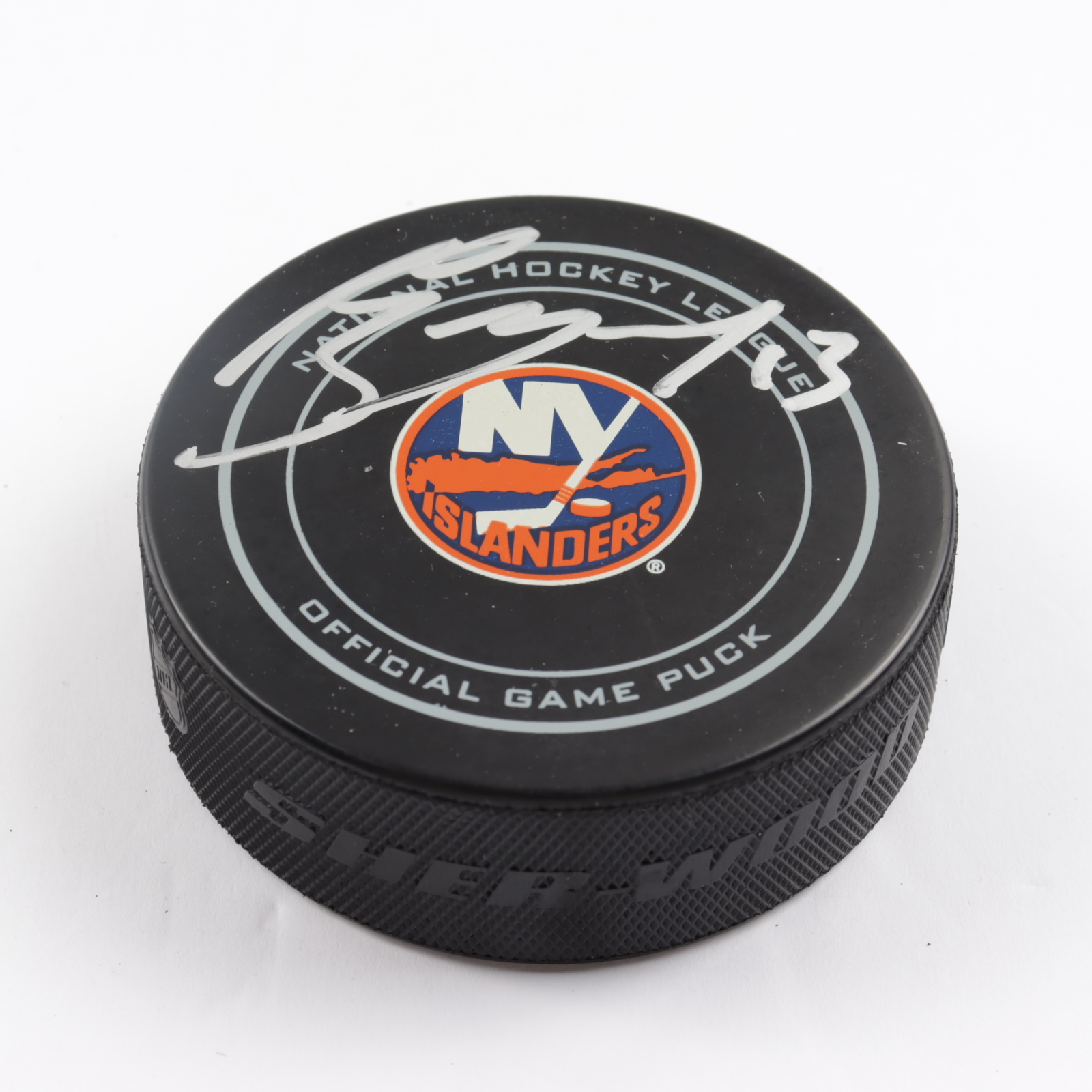 New York Islanders logo hockey puck. Hand-signed by Mathew Barzal.