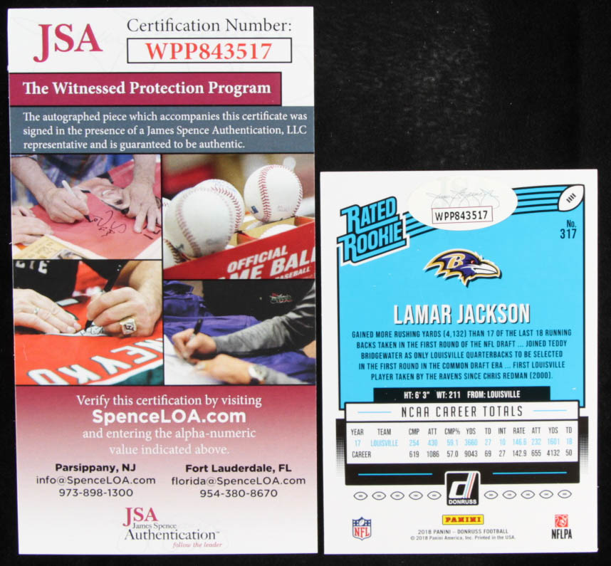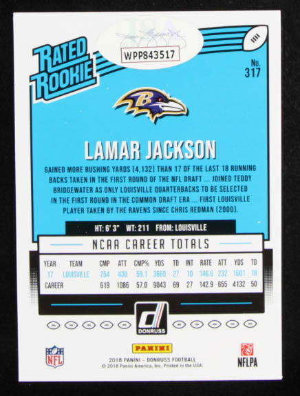 Lamar Jackson Signed 2018 Donruss #317 RR RC (JSA COA)