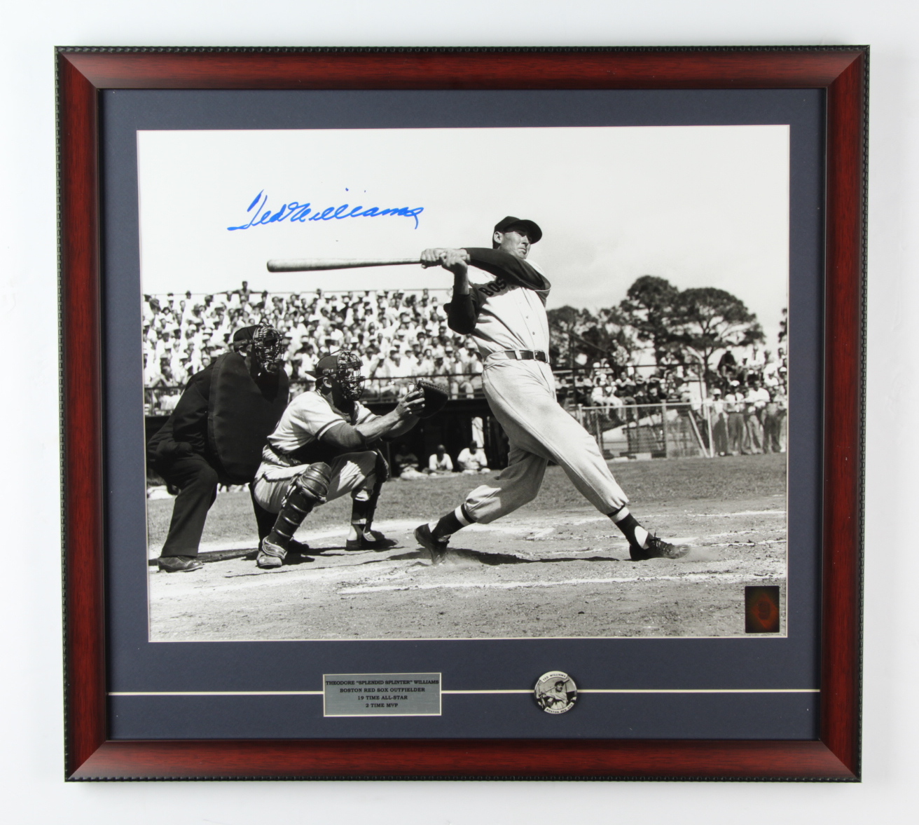 Custom frame measures 21" x 23" in size and features a photo that has been hand-signed by Ted Williams (D. 2002, Boston Red Sox, HOF). Display also features a Ted Williams pin.