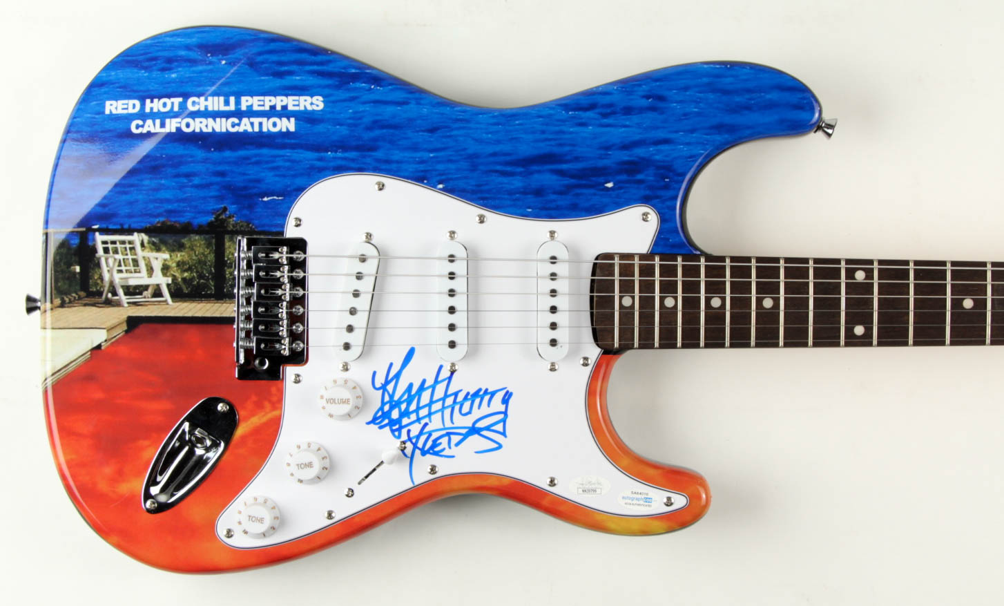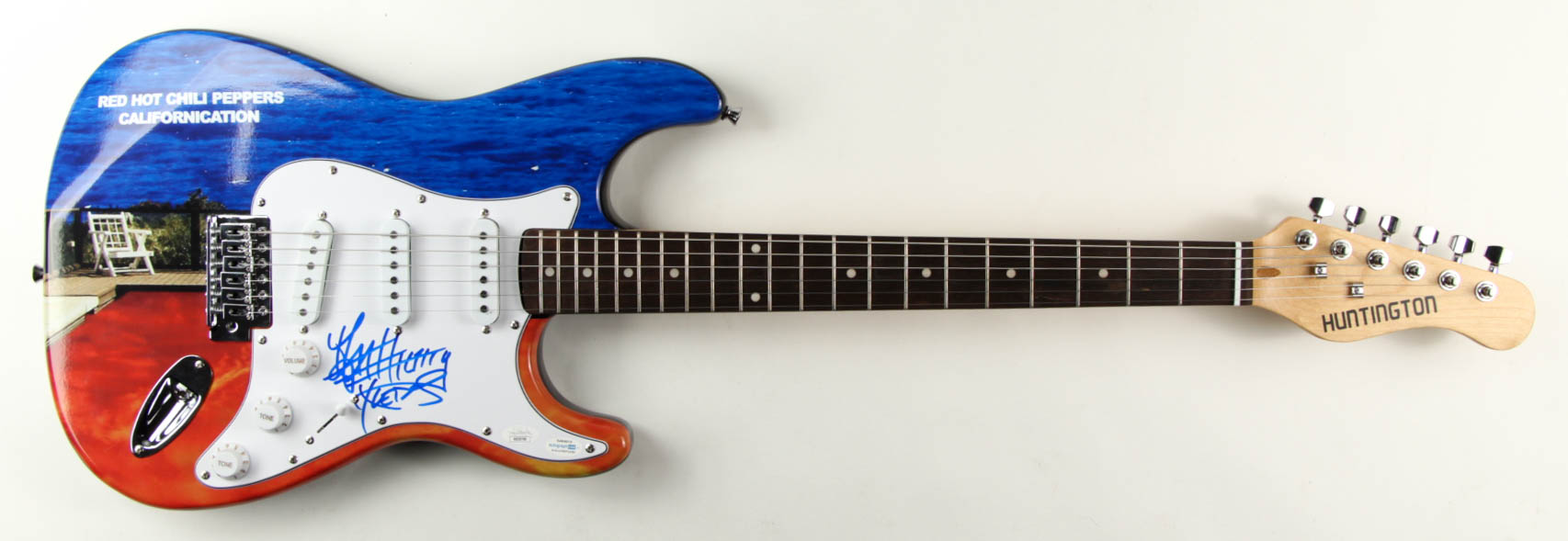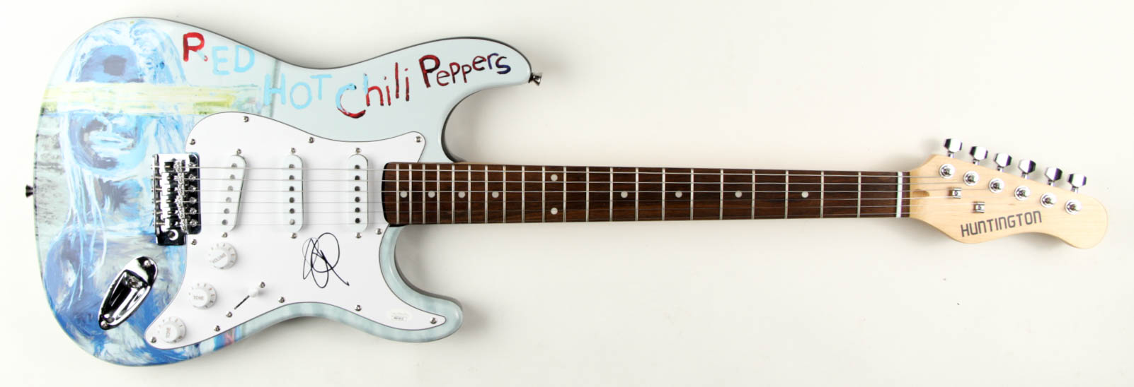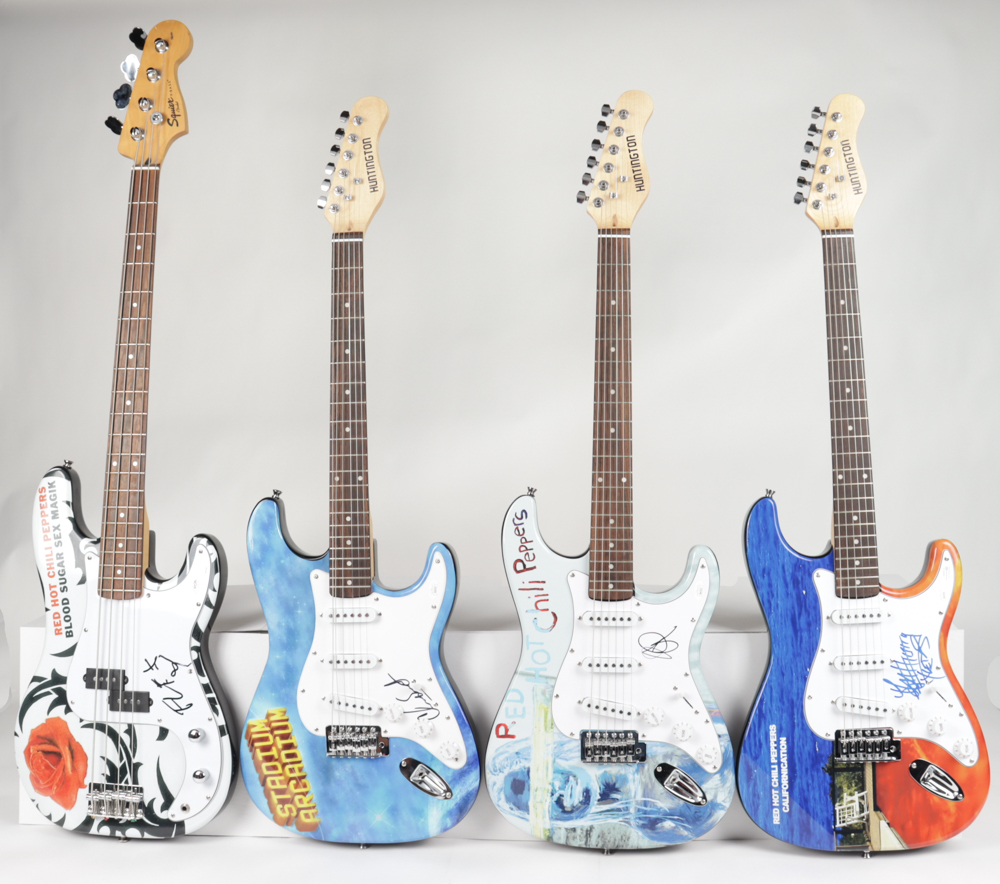 Electric Fender bass guitar measures approximately 46" in length and has been Individually hand-signed on the pick guard by Flea, (3) Huntington electric guitars measures approximately 39" in length and have been individually hand-signed on the pick guards by Anthony Kiedis, John Frusciante and Chad Smith. Please note, see images regarding condition of guitars.