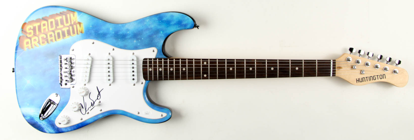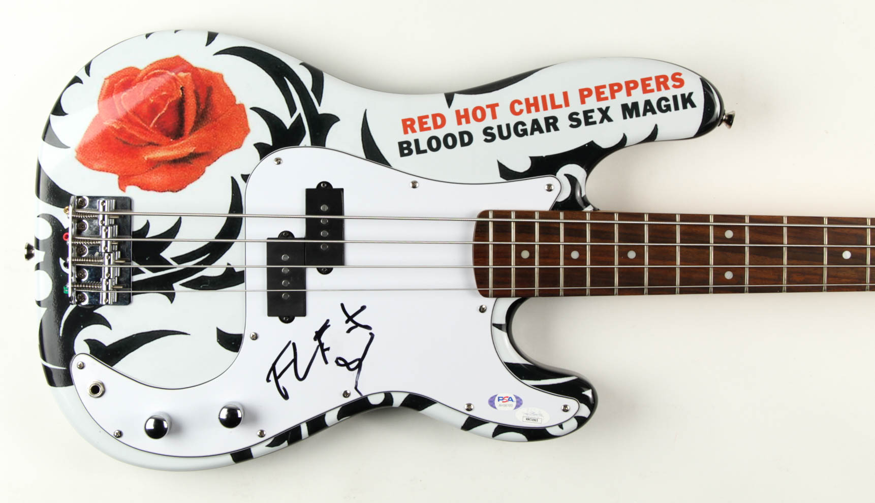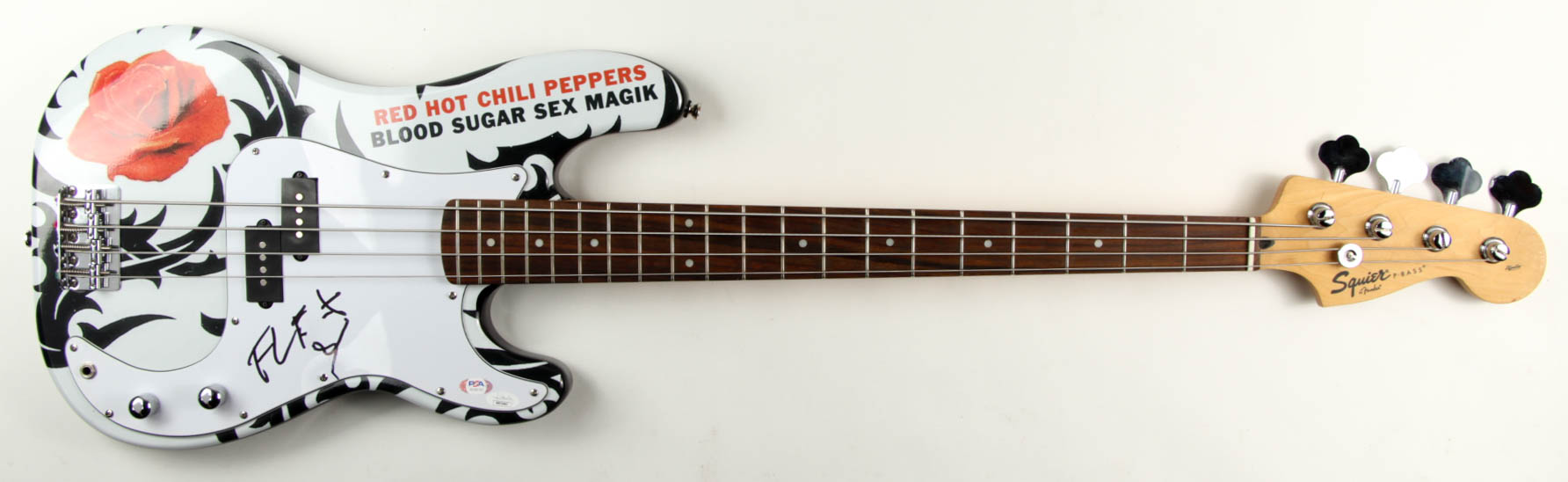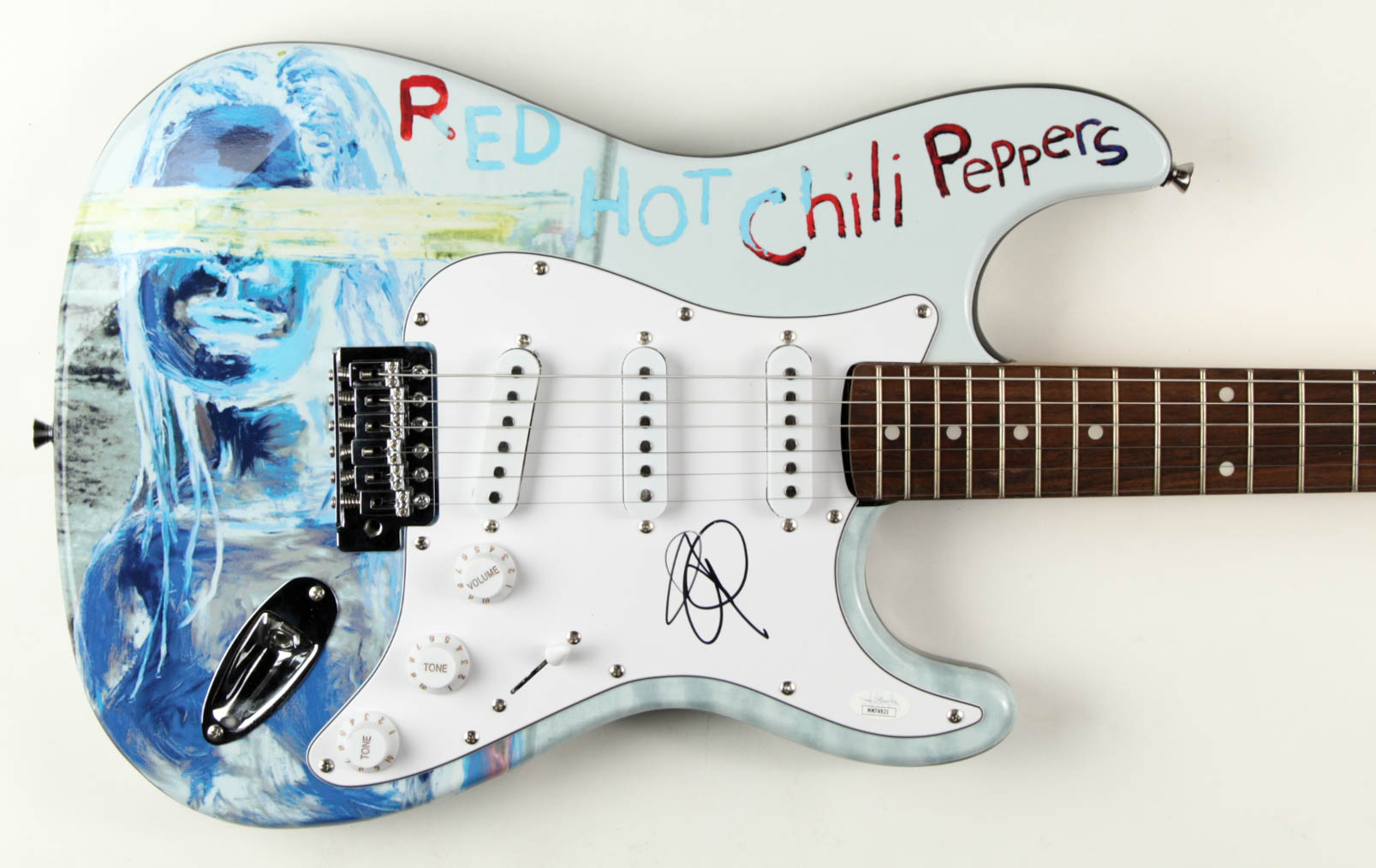 Electric Fender bass guitar measures approximately 46" in length and has been Individually hand-signed on the pick guard by Flea, (3) Huntington electric guitars measures approximately 39" in length and have been individually hand-signed on the pick guards by Anthony Kiedis, John Frusciante and Chad Smith. Please note, see images regarding condition of guitars.