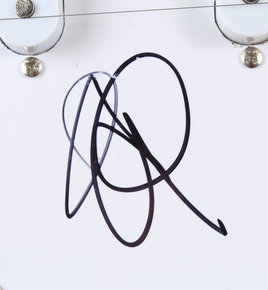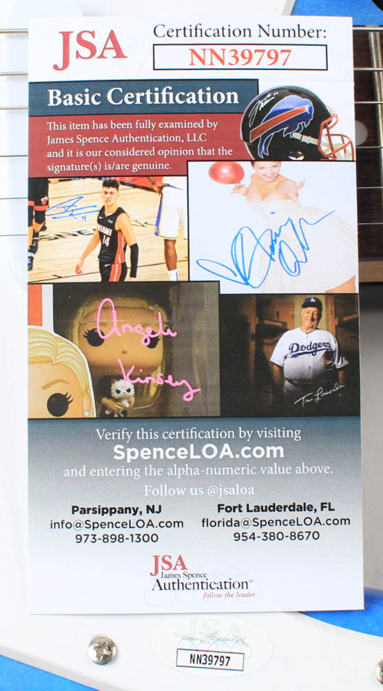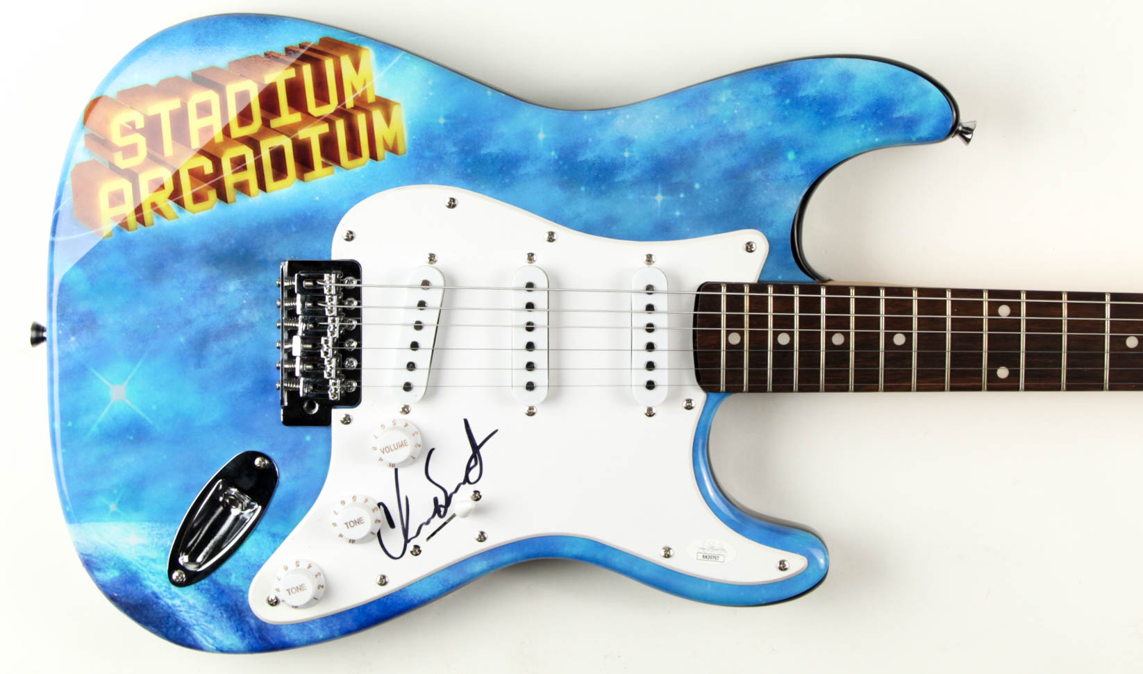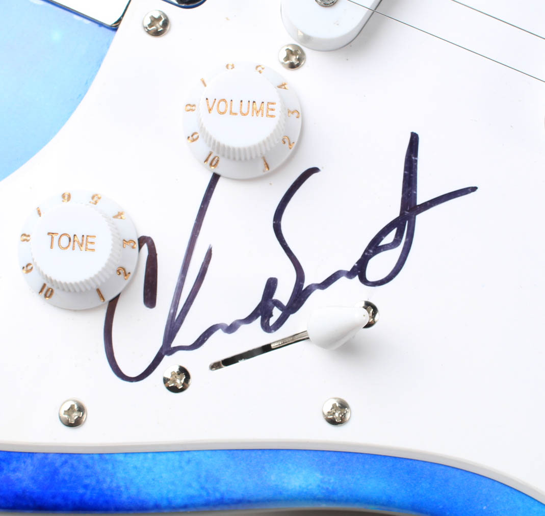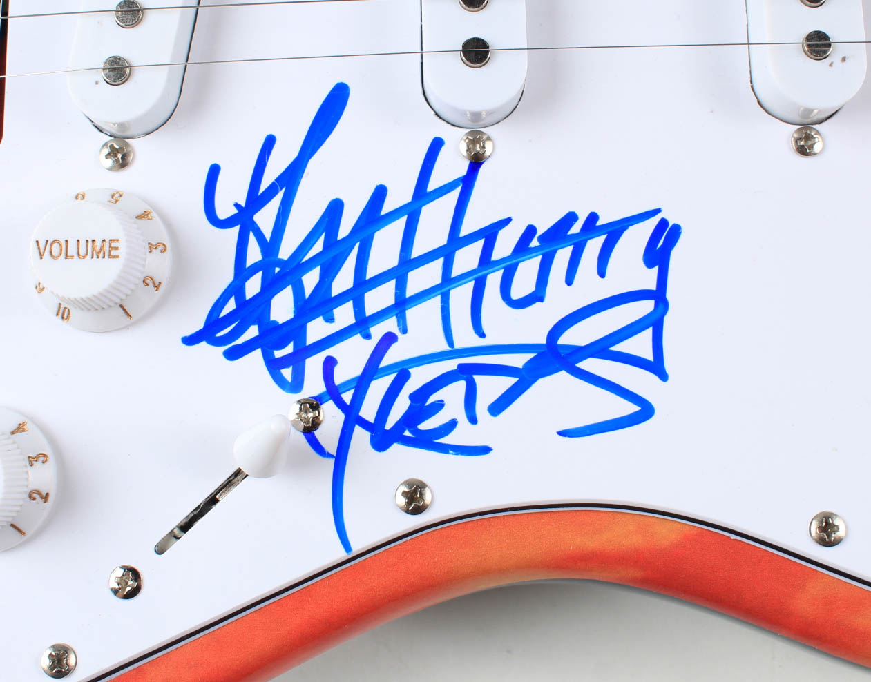 Electric Fender bass guitar measures approximately 46" in length and has been Individually hand-signed on the pick guard by Flea, (3) Huntington electric guitars measures approximately 39" in length and have been individually hand-signed on the pick guards by Anthony Kiedis, John Frusciante and Chad Smith. Please note, see images regarding condition of guitars.
