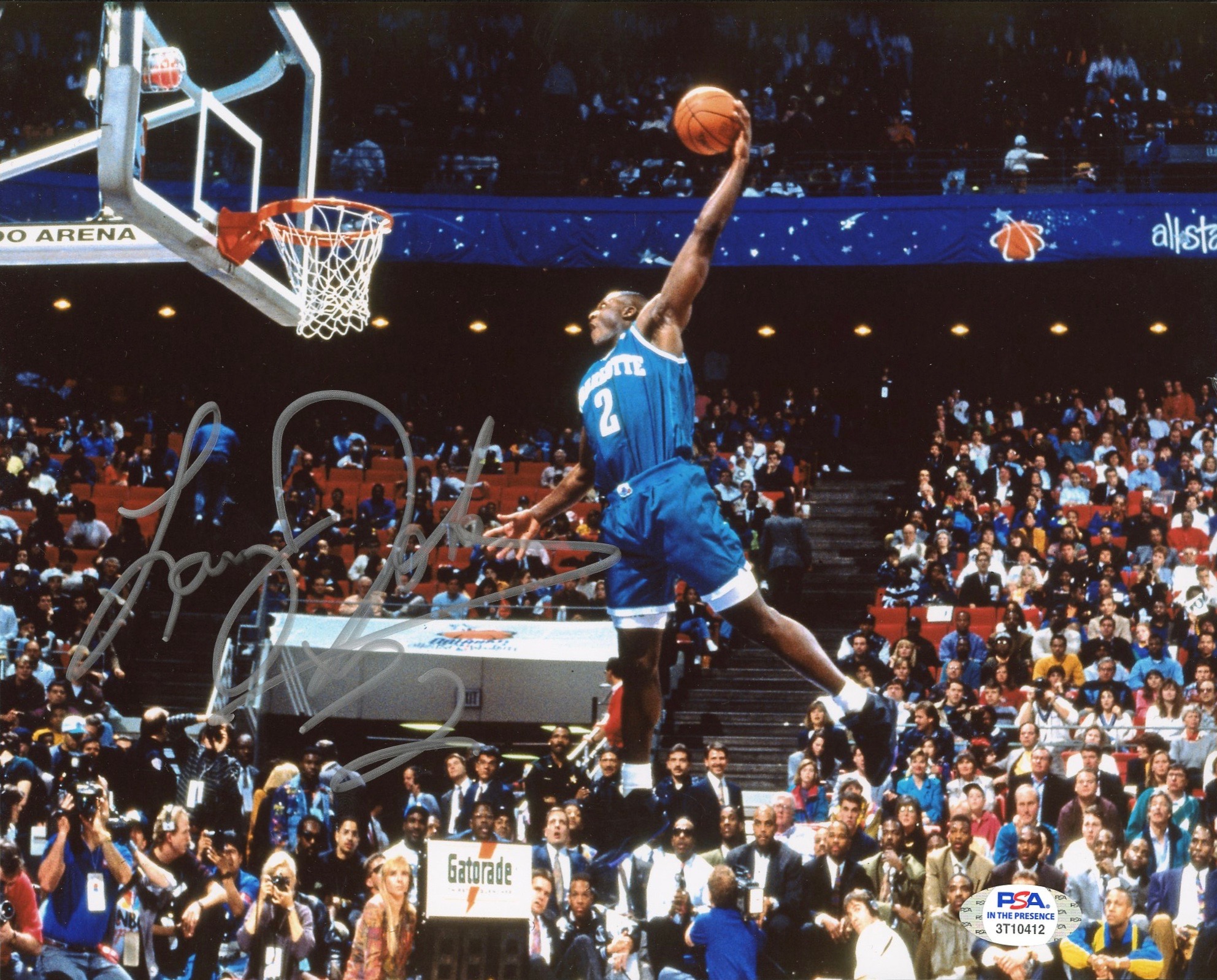 Photo measures 8" x 10" in size and has been hand-signed by Larry Johnson (Charlotte Hornets).