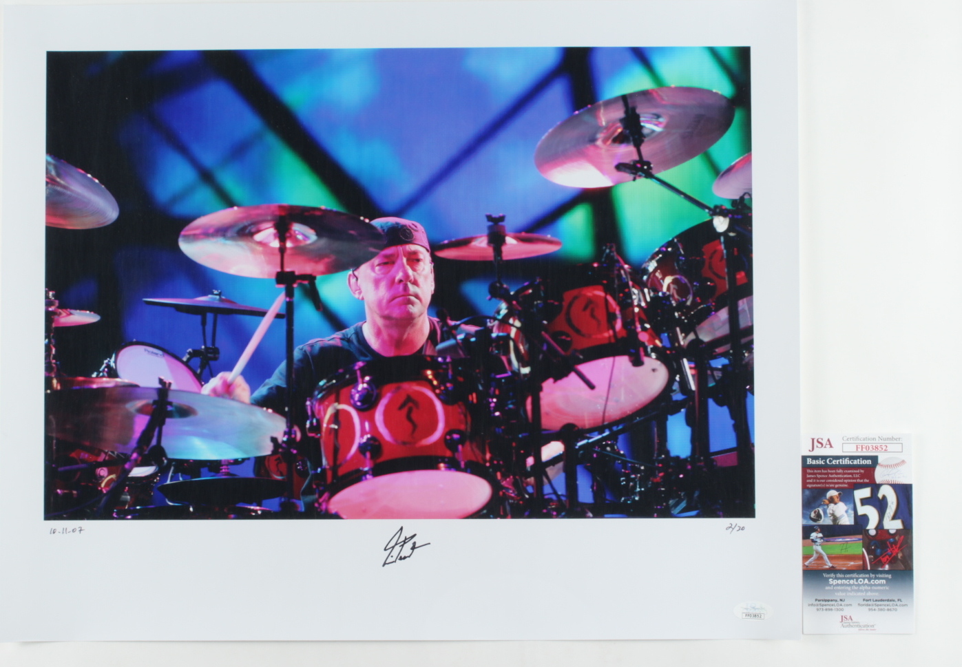 Photo measures 16" x 20" in size and has been hand-signed by Neil Peart (D. 2020). The photo is limited edition and hand-numbered #2/30.