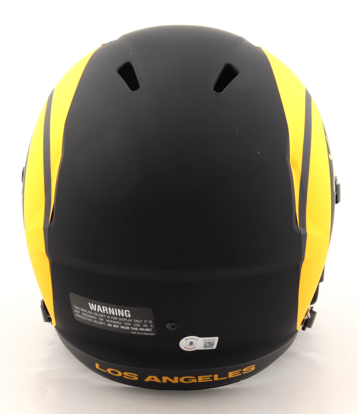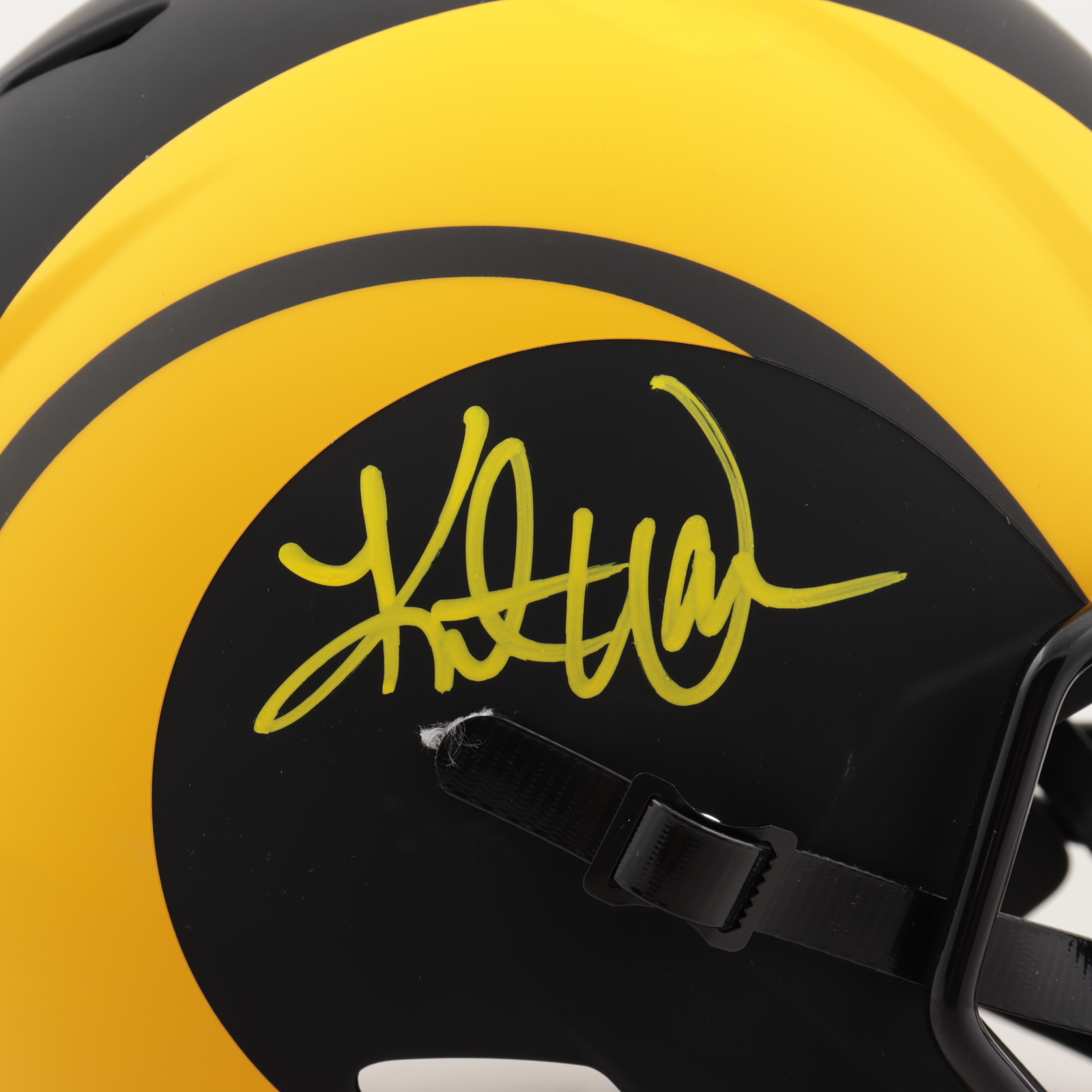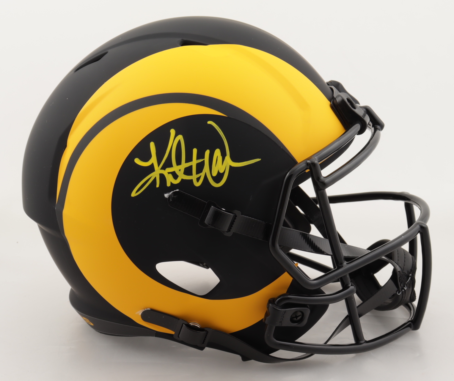 Riddell Los Angeles Rams full-size replica eclipse alternate speed helmet. Has been hand-signed by Kurt Warner (HOF).
