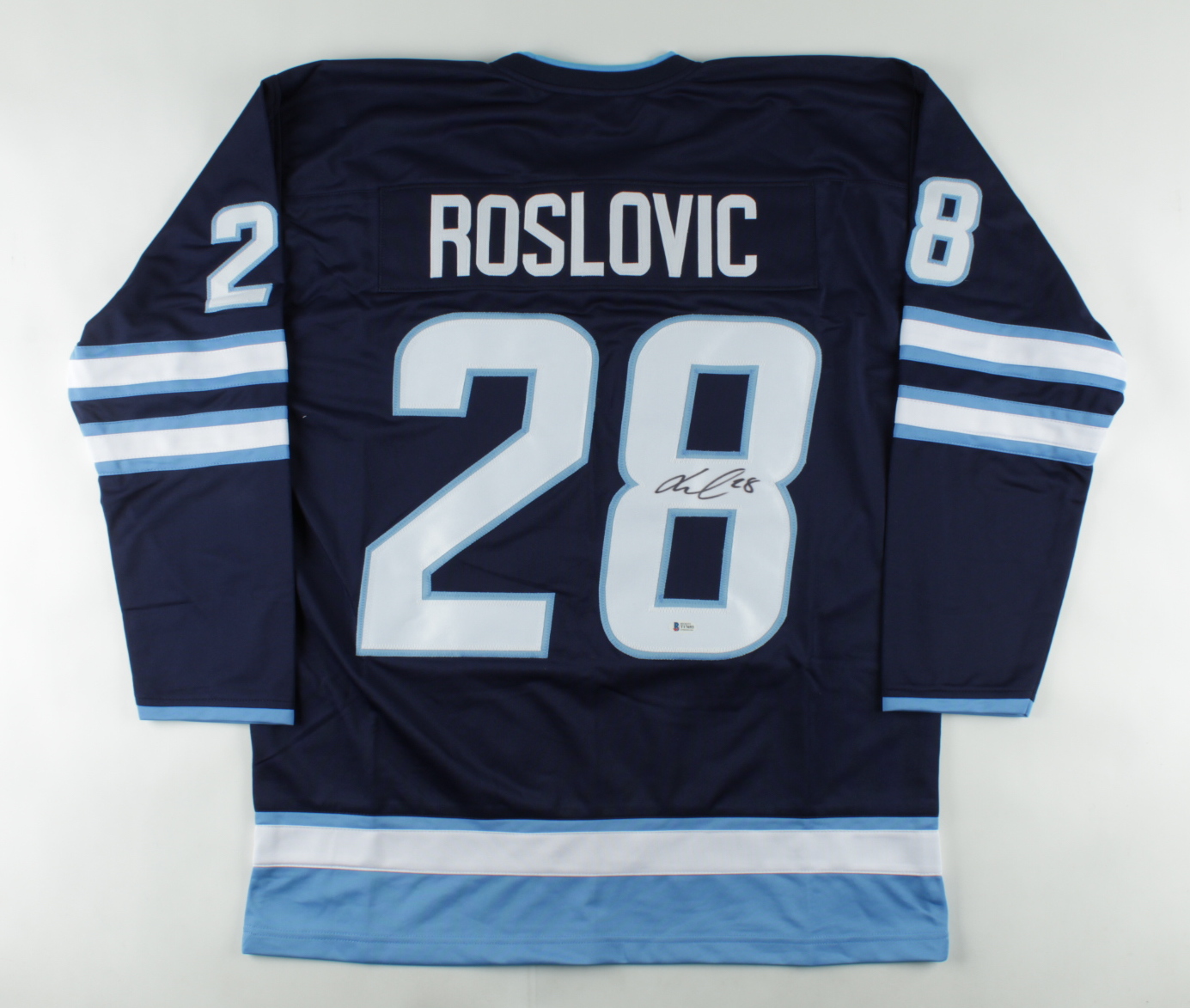 Custom on-ice style jersey. Everything is sewn on, size XL. Hand-signed by Jack Roslovic.