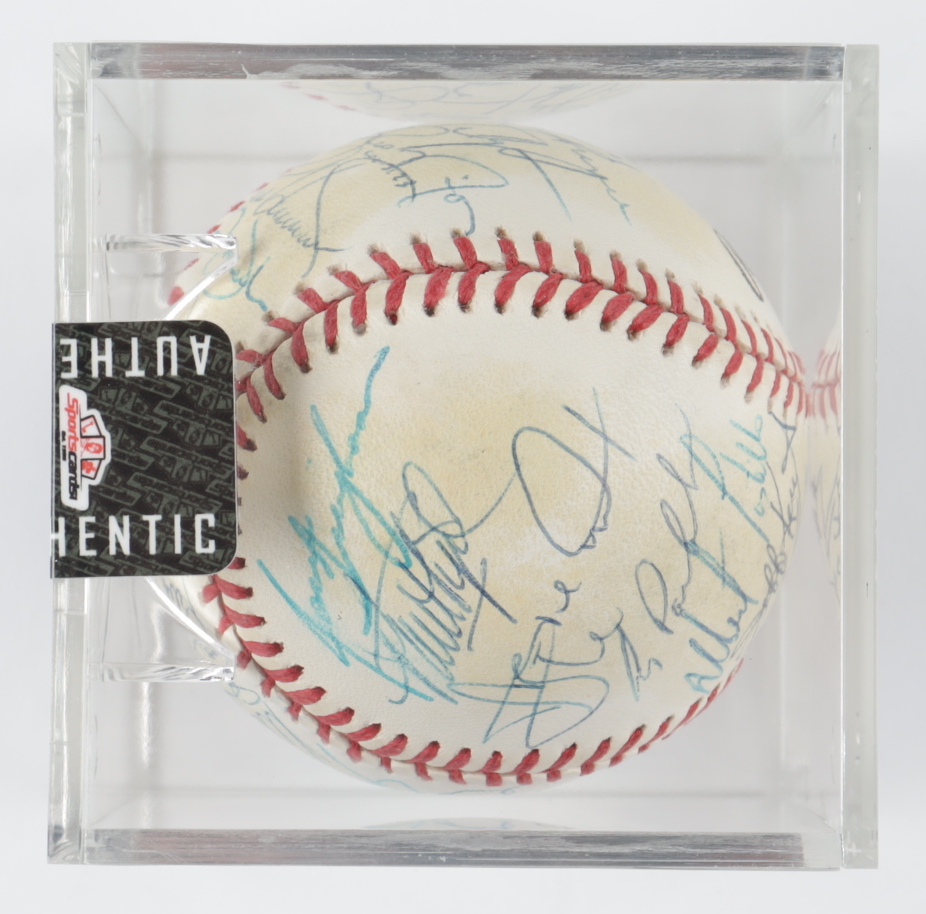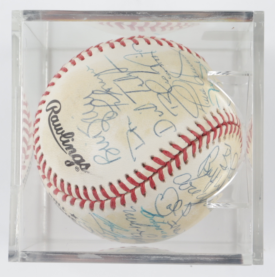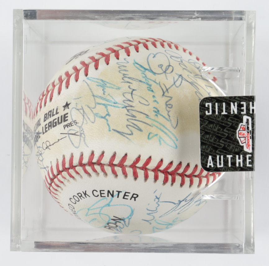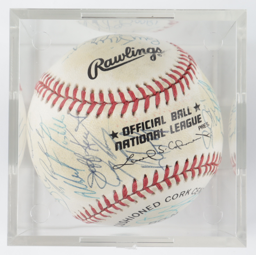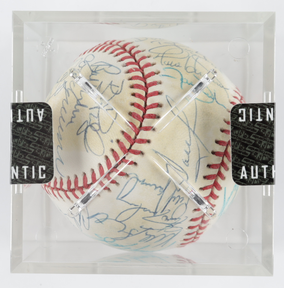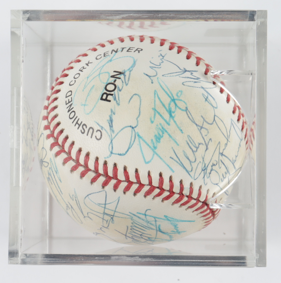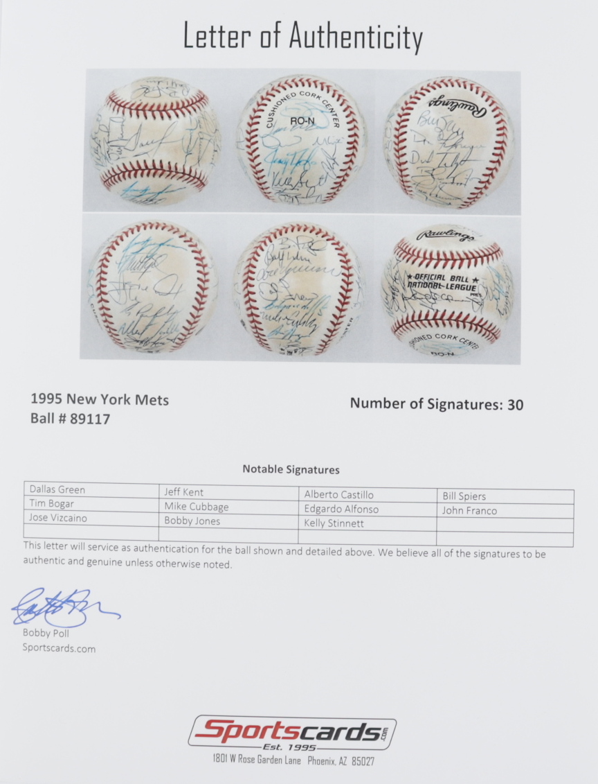 Rawlings Official National League baseball. Hand-signed by (30) including Dallas Green, Jeff Kent, Alberto Castillo, Bill Spiers, Tim Bogar, Mike Cubbage, Edgardo Alfonso, John Franco, Jose Vizcaino, Bobby Jones, Kelly Stinnett, and (19) others. Please note, the baseball shows signs of natural toning. Includes the display case shown. (New York Mets)