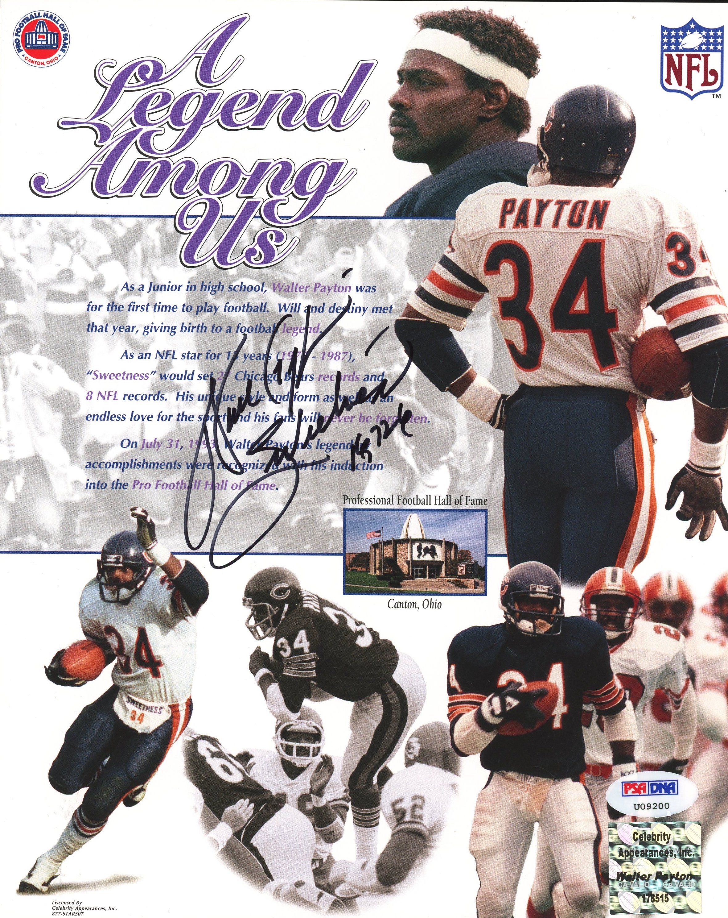 Photo measures 8" x 10" in size and has been hand-signed by Walter Payton (D. 1999, Chicago Bears, HOF).