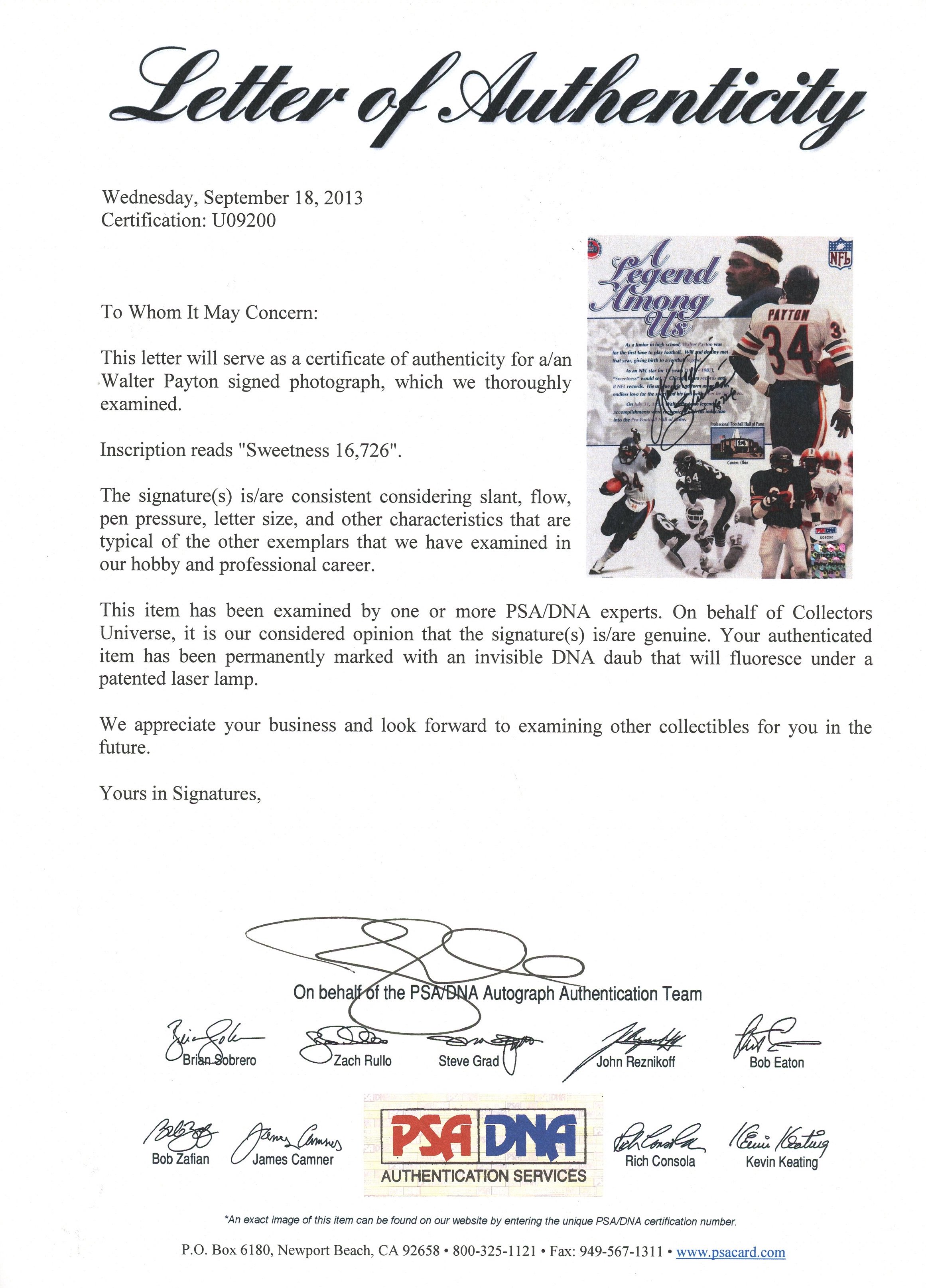 Walter Payton Signed Bears "A Legend Among Us" 8x10 Photo Inscribed "Sweetness" & "16,726" (PSA LOA)