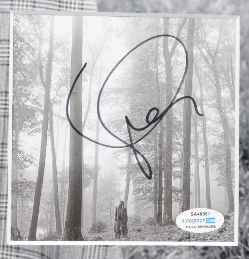 Display measures approximately 18" x 22" in size and features a cut that has been hand-signed by Taylor Swift. Display features a "Folklore" CD.