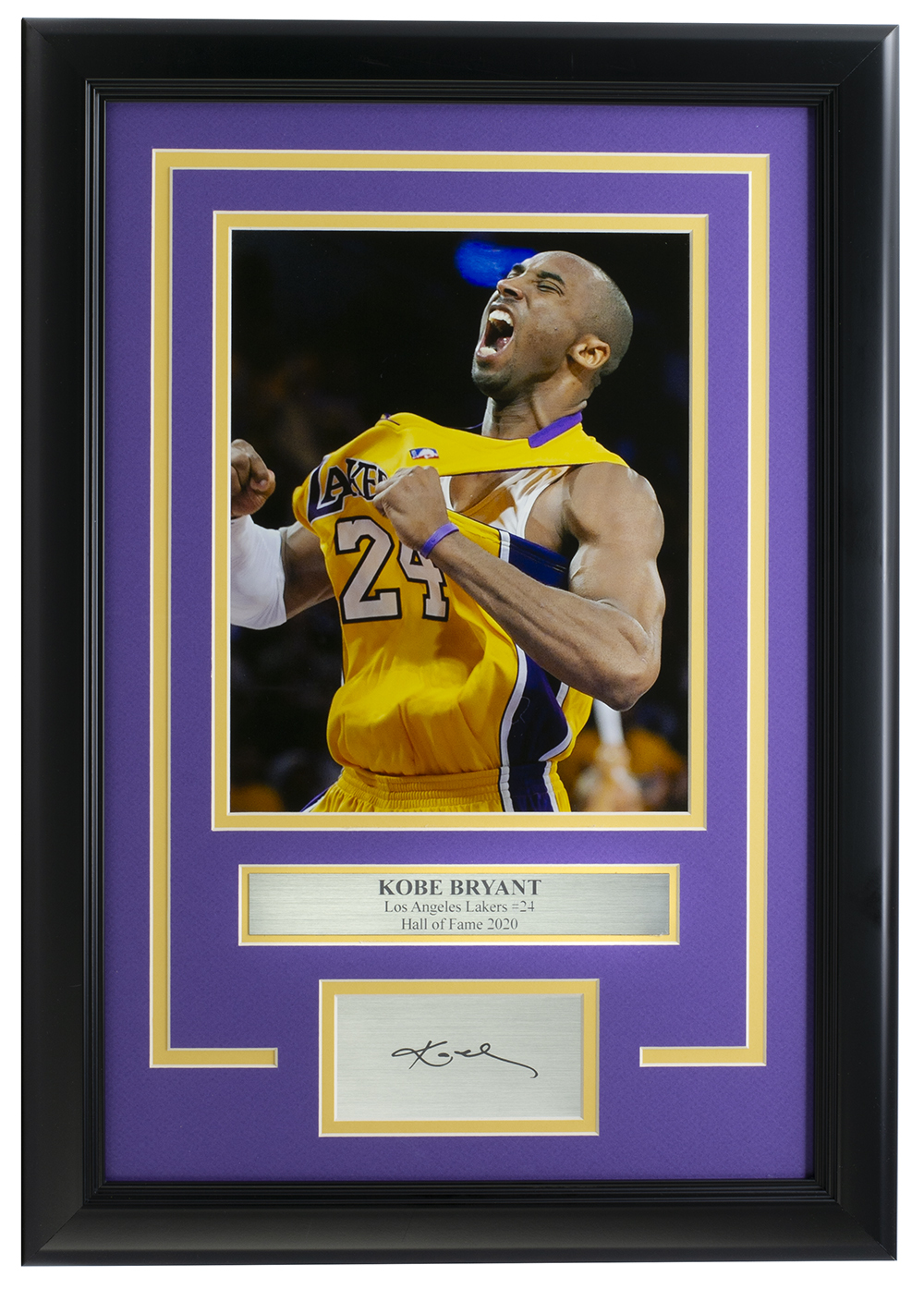Custom frame measures 14" x 18" in size. Features a photo of Kobe Bryant (D. 2020, Los Angeles Lakers, HOF). Please note, the signature is a laser engraved facsimile.