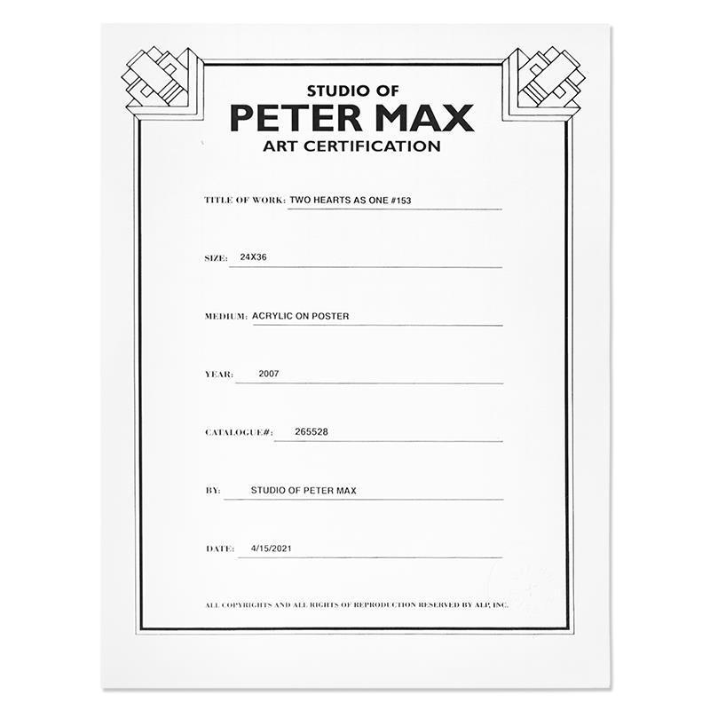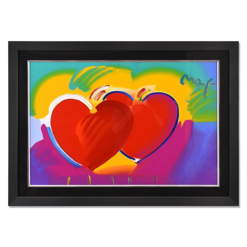 "Two Hearts As One" is a one-of-a-kind acrylic mixed media on paper, hand signed by Peter Max. This piece comes custom framed. Includes Certificate of Authenticity from Peter Max Studios. Measures approx. 43" x 31" (with frame), 35" x 23" (image).