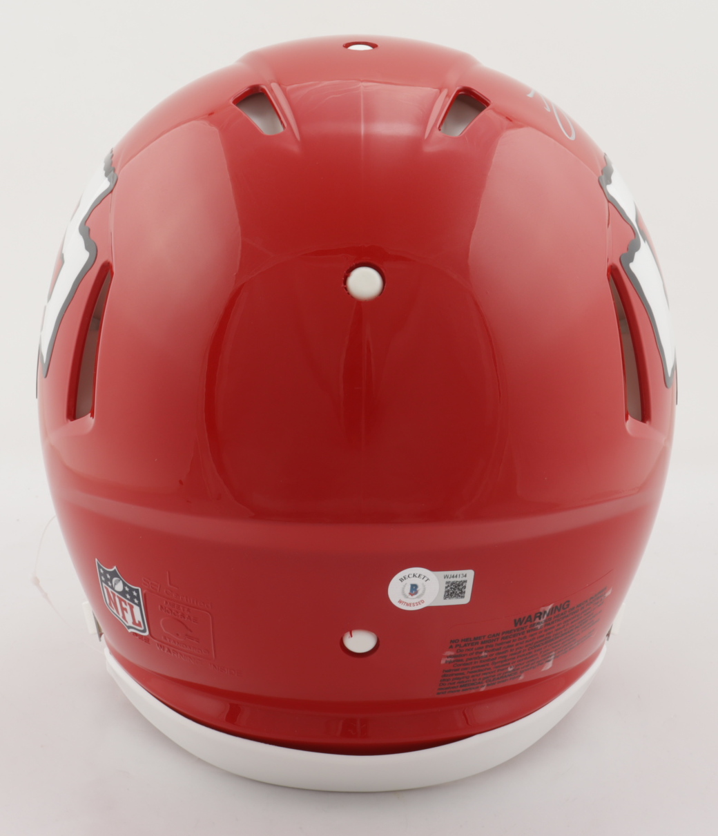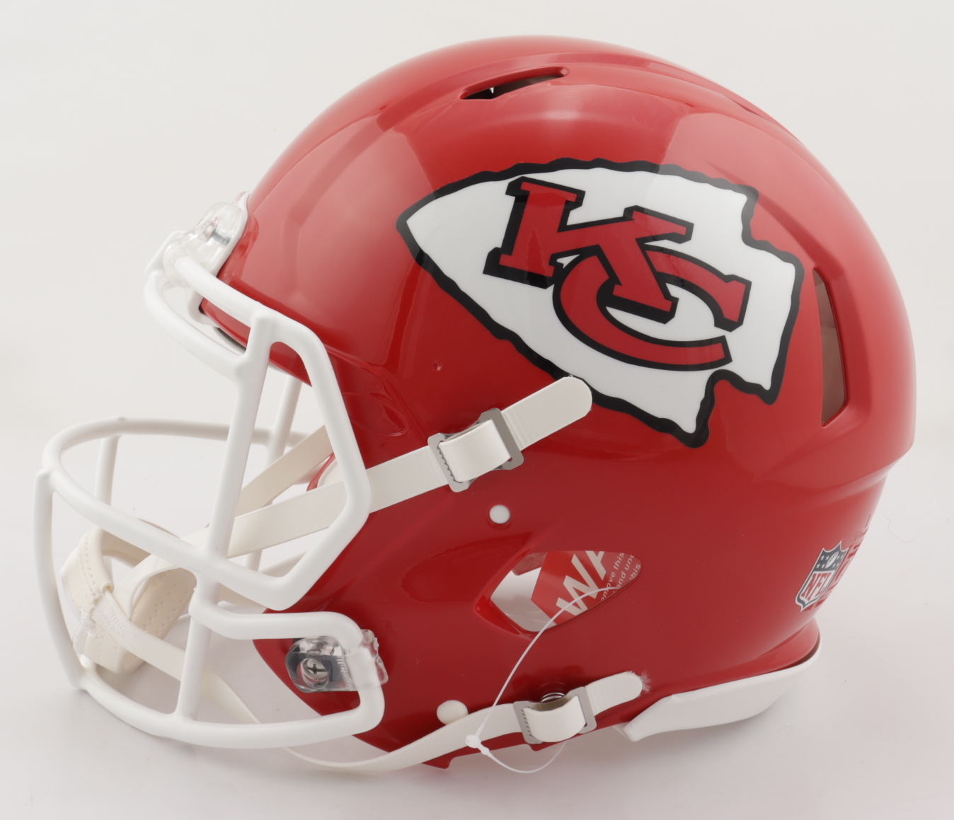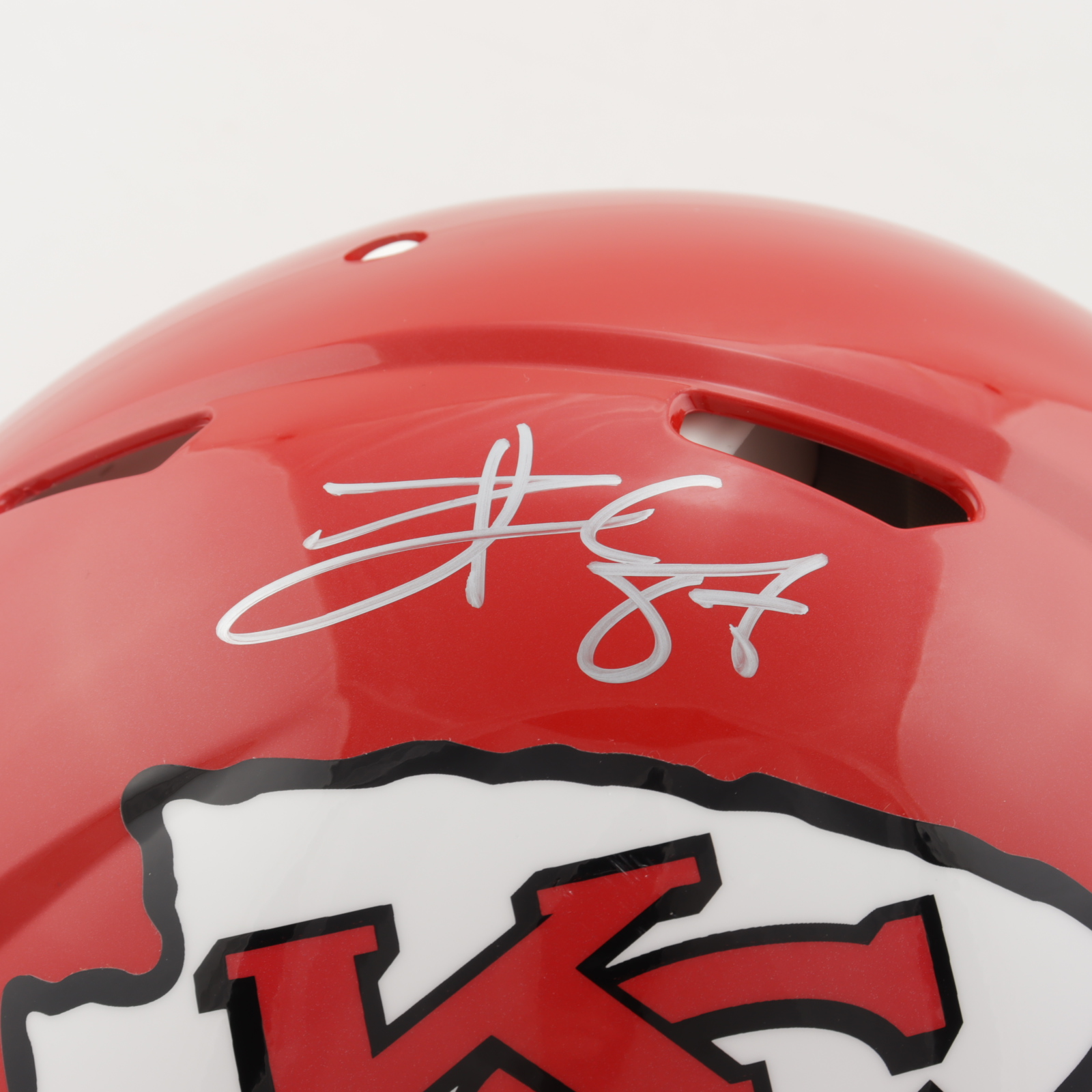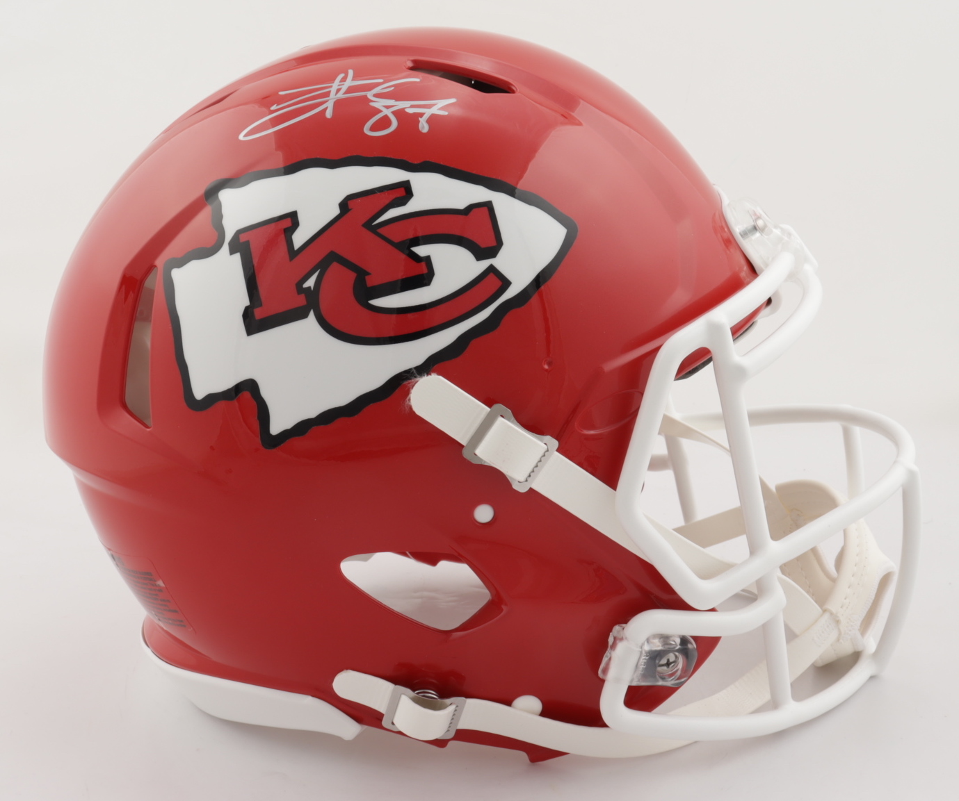 Riddell Kansas City Chiefs full-size authentic on-field speed helmet. Has been hand-signed by Travis Kelce.