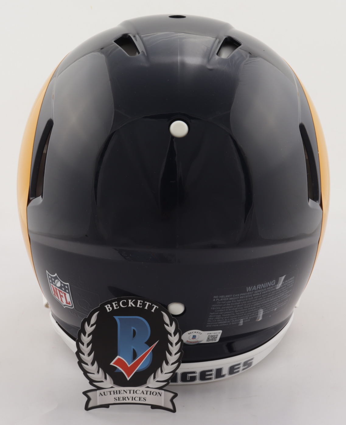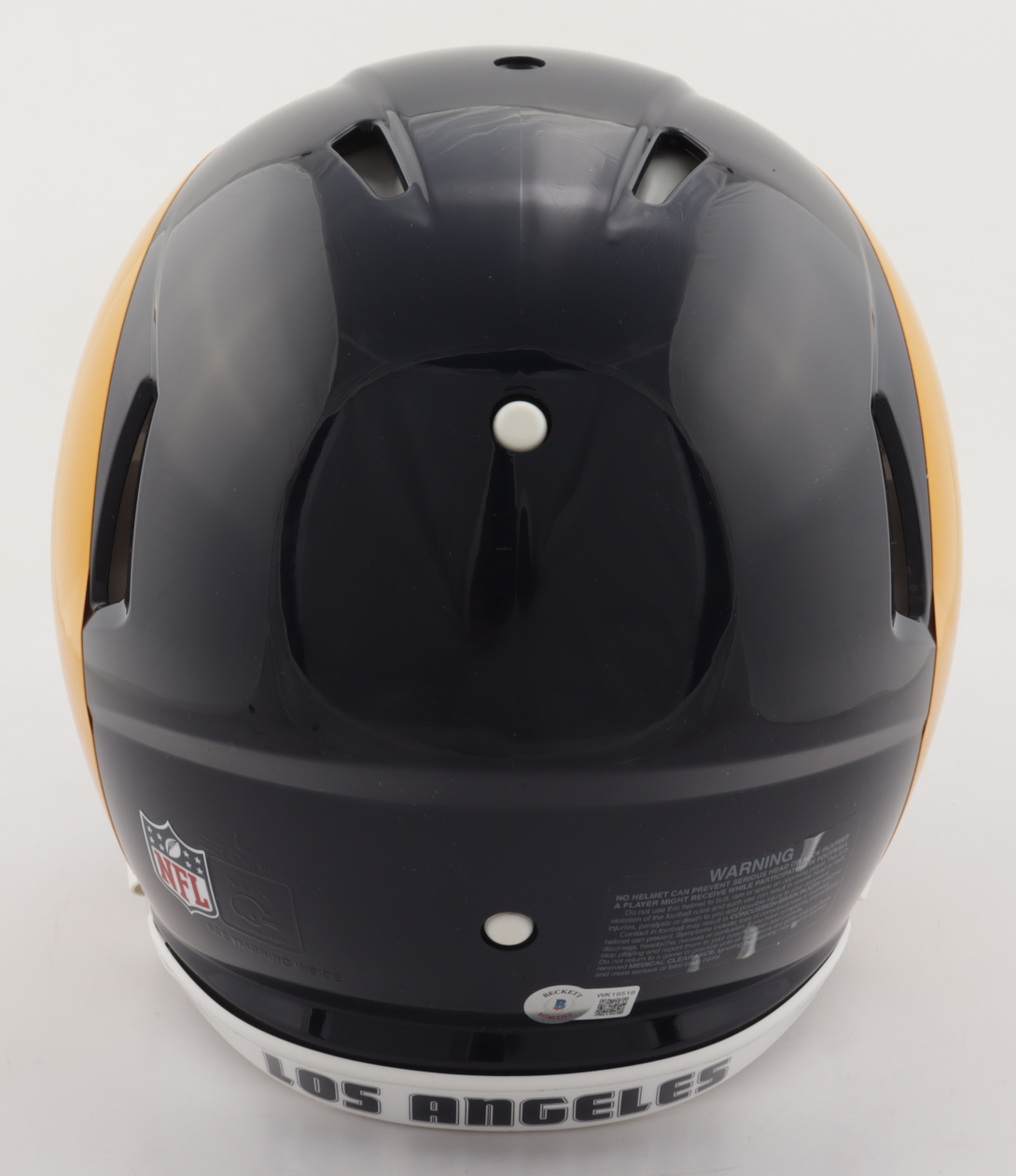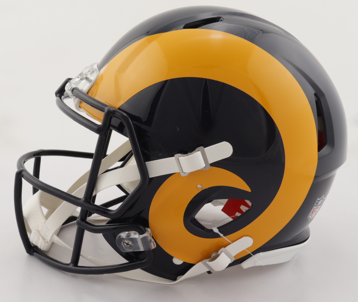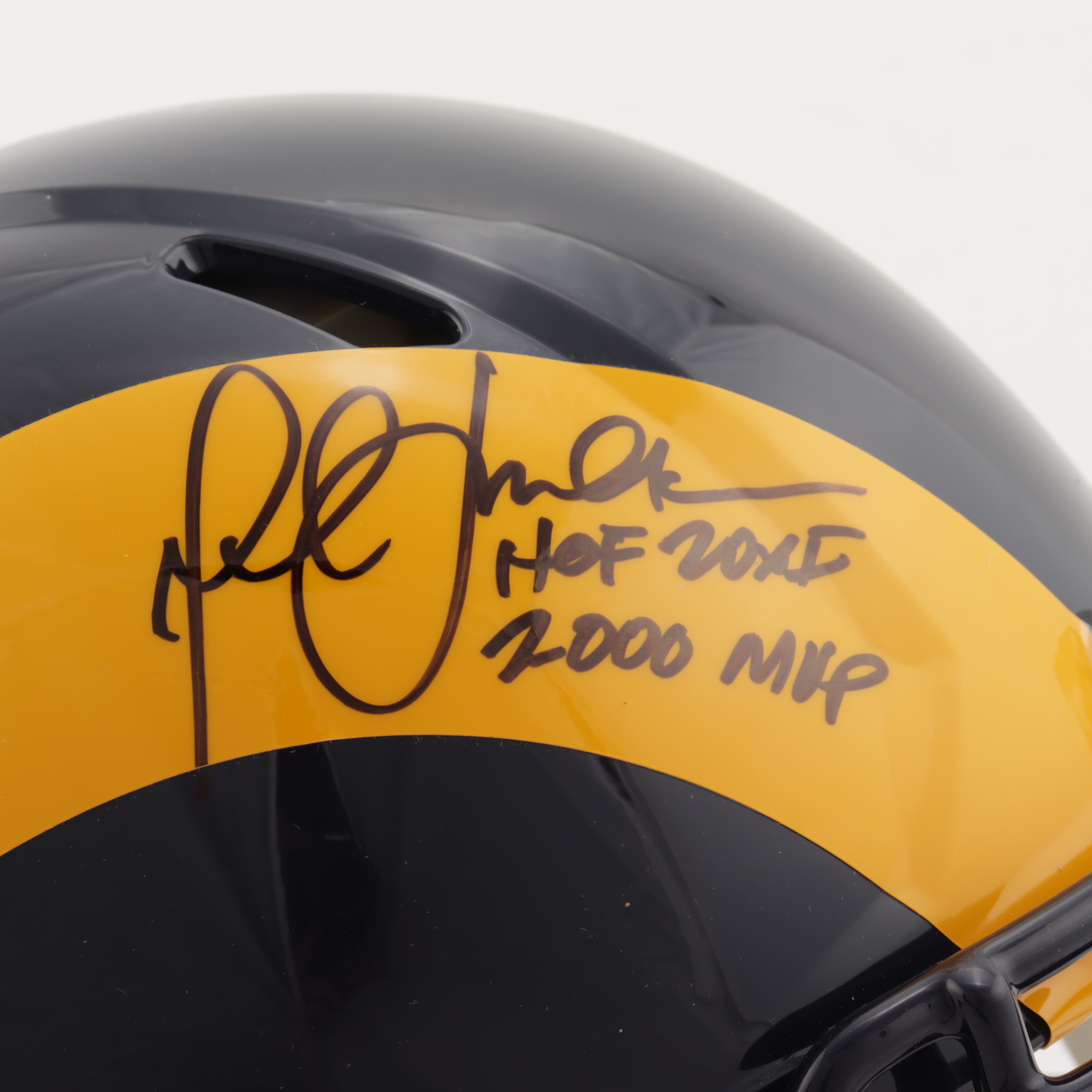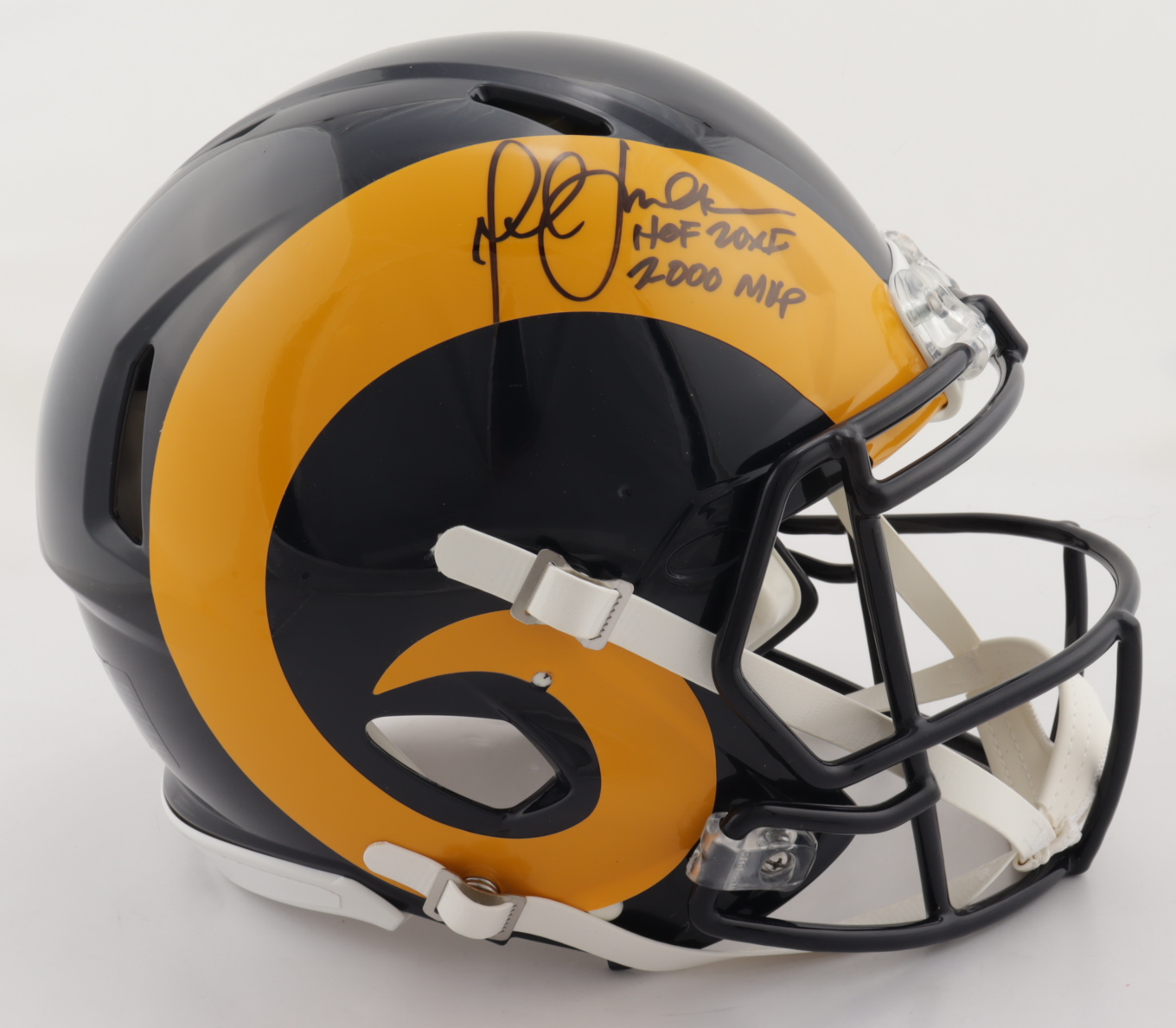Riddell Los Angeles Rams full-size authentic on-field speed helmet. Has been hand-signed by Marshall Faulk (HOF).