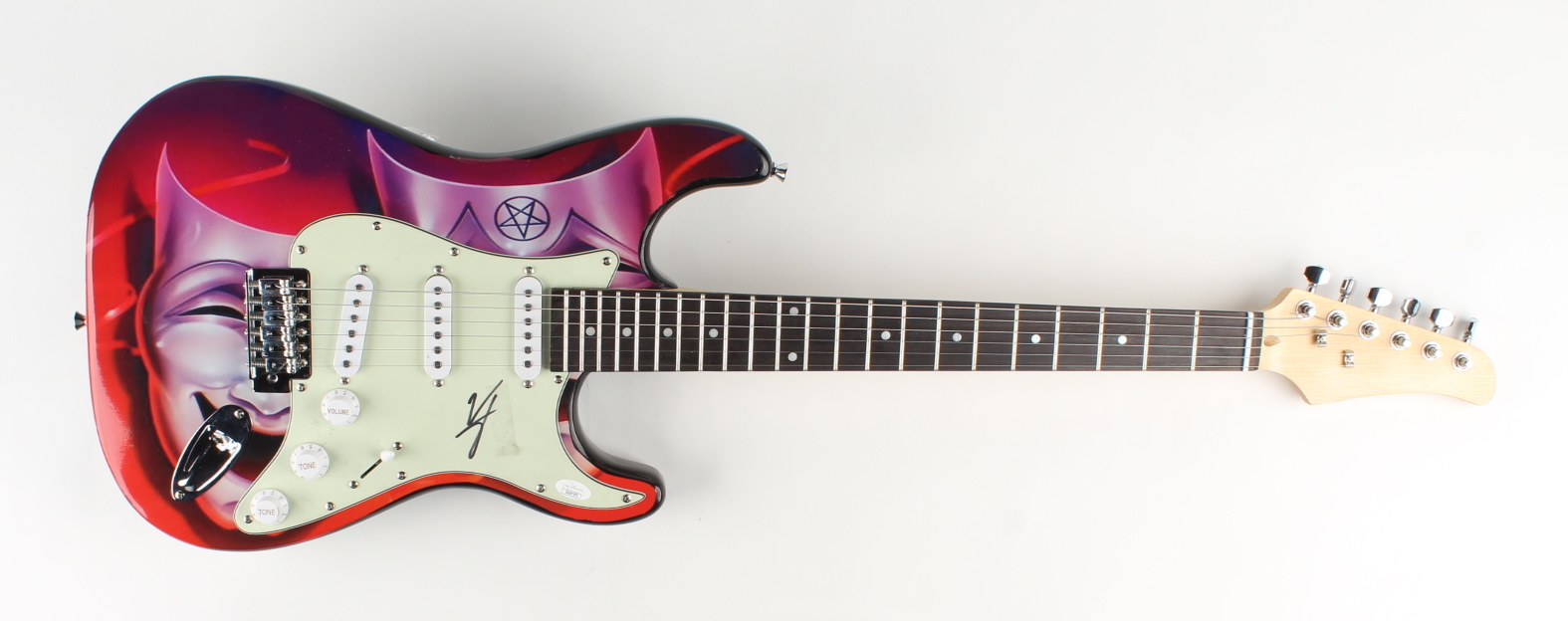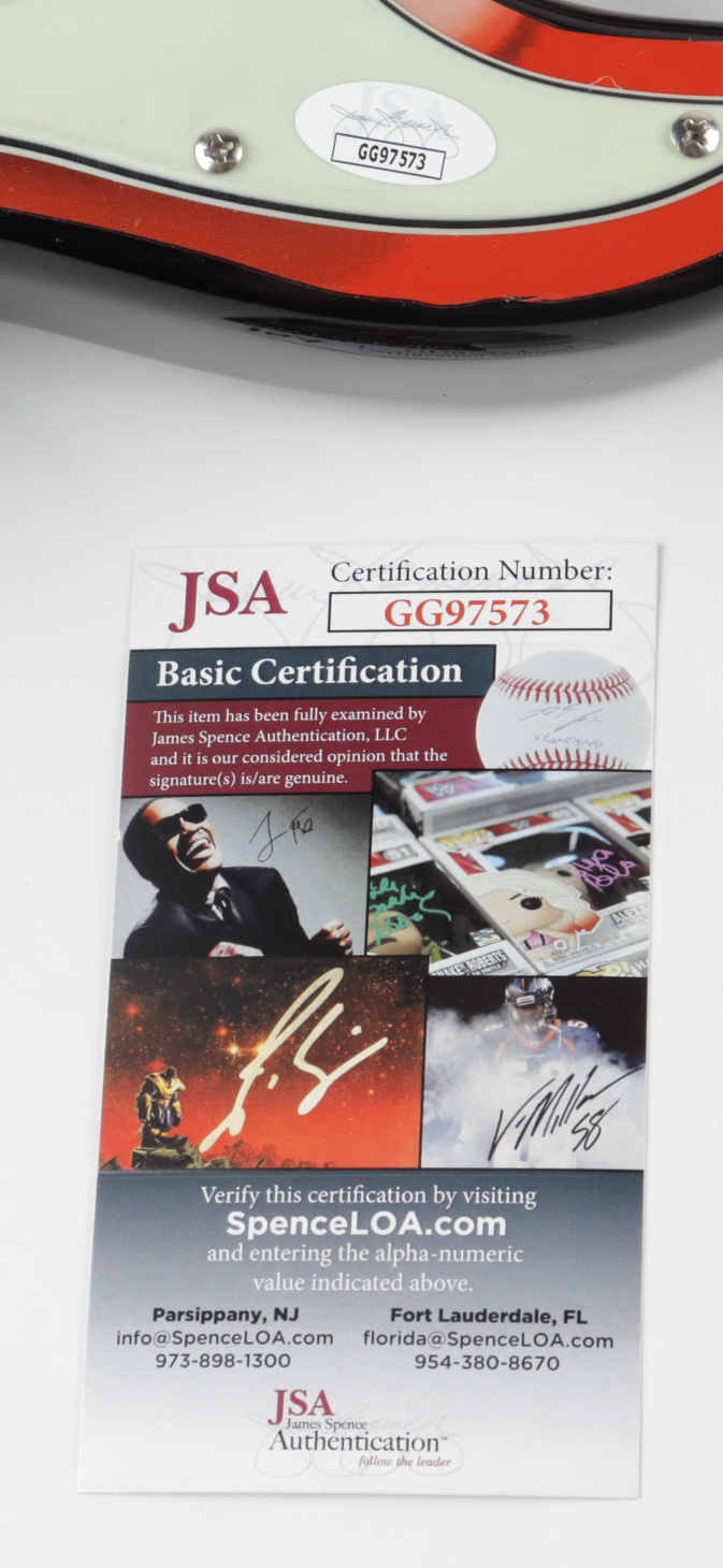 Electric guitar measures 39" in size and has been hand-signed in by Vince Neil. Please note, the pick guard has some stains, and the guitar body has scratches.