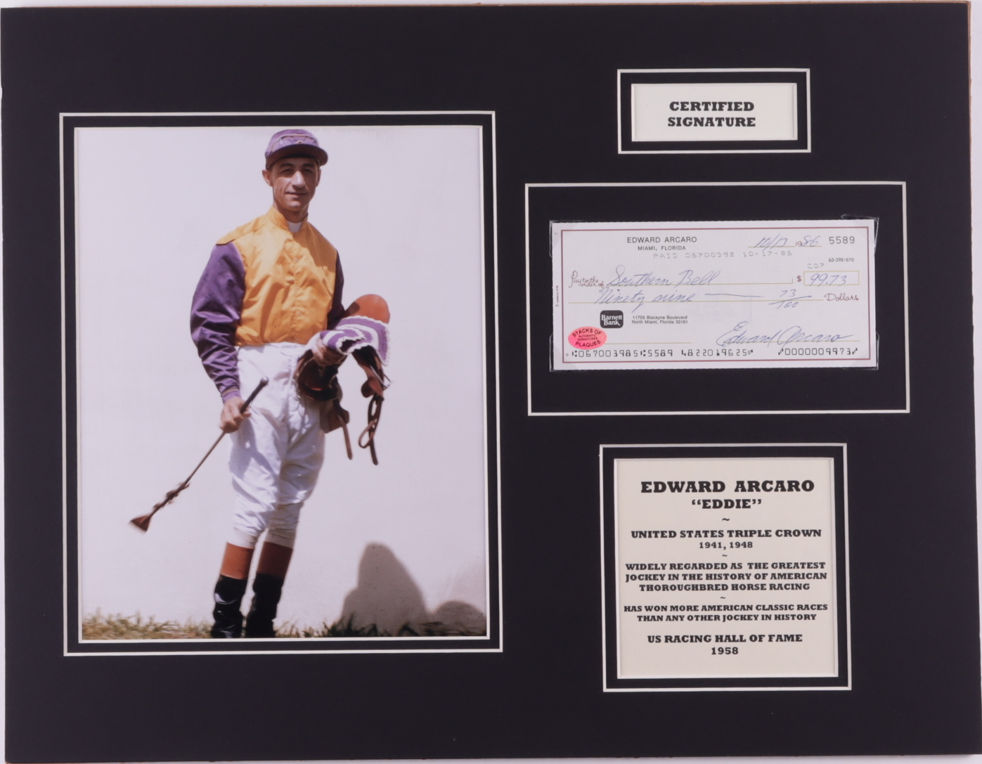 Eddie Arcaro Signed 14x18 Custom Matted Check Display (SOP COA)