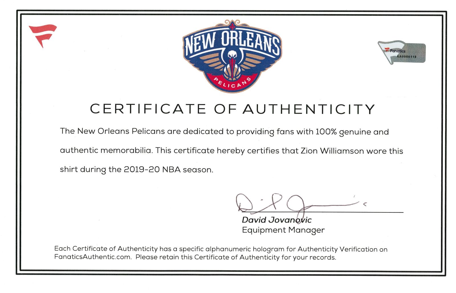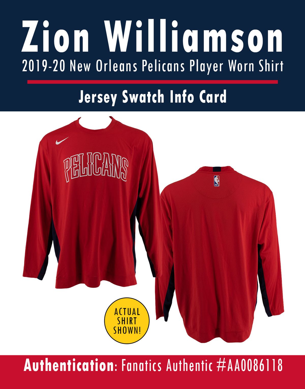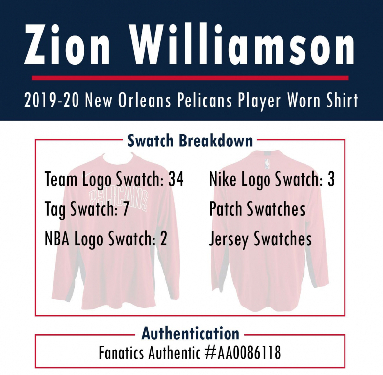 This player-worn swatch comes from a 2019-20 New Orleans Pelicans shirt worn by Zion Williamson. Authenticated by Fanatics. Player-worn swatches have NEVER been offered to the public in this format. Check out what you might find!