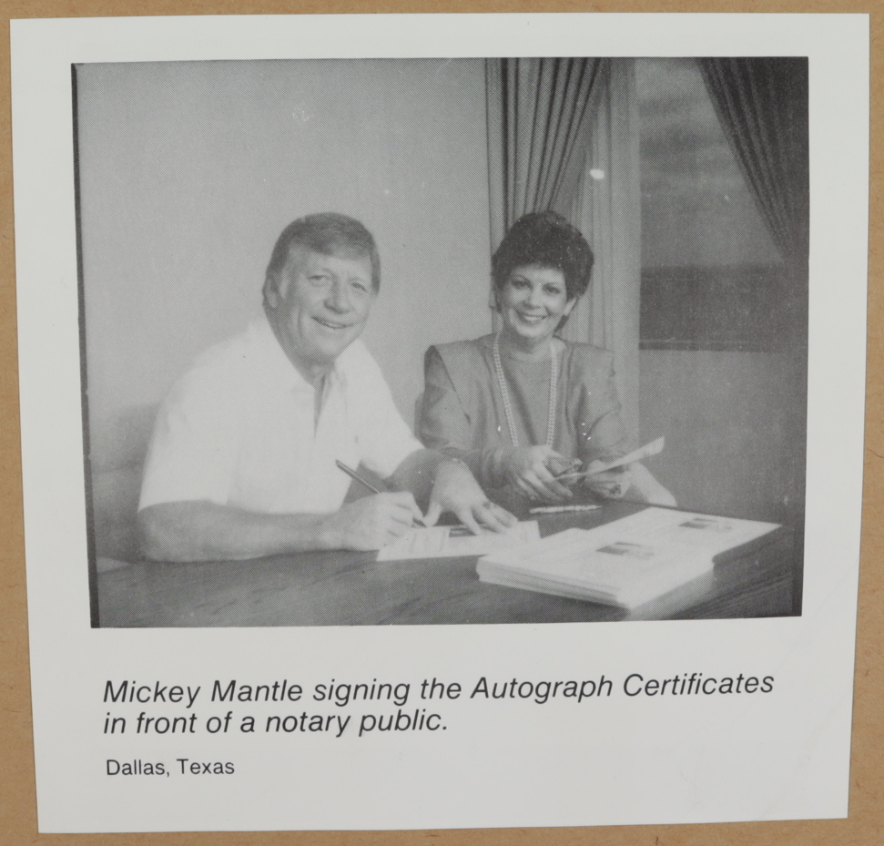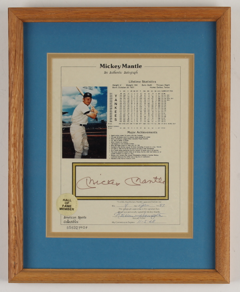 Custom frame measures 12" x 15" in size and features a stat card that has been hand-signed by Mickey Mantle (D. 1995, New York Yankees, HOF).