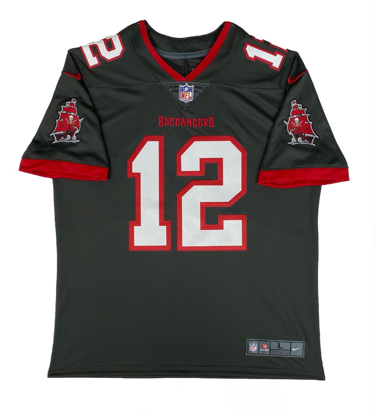 Nike on-field style jersey. Everything sewn on, size L. Hand-signed and inscribed by Tom Brady (Tampa Bay Buccaneers).