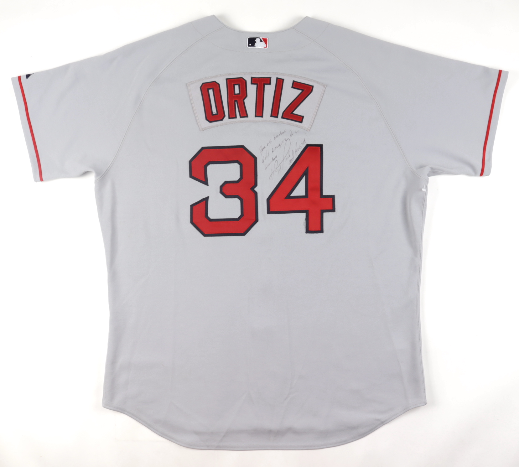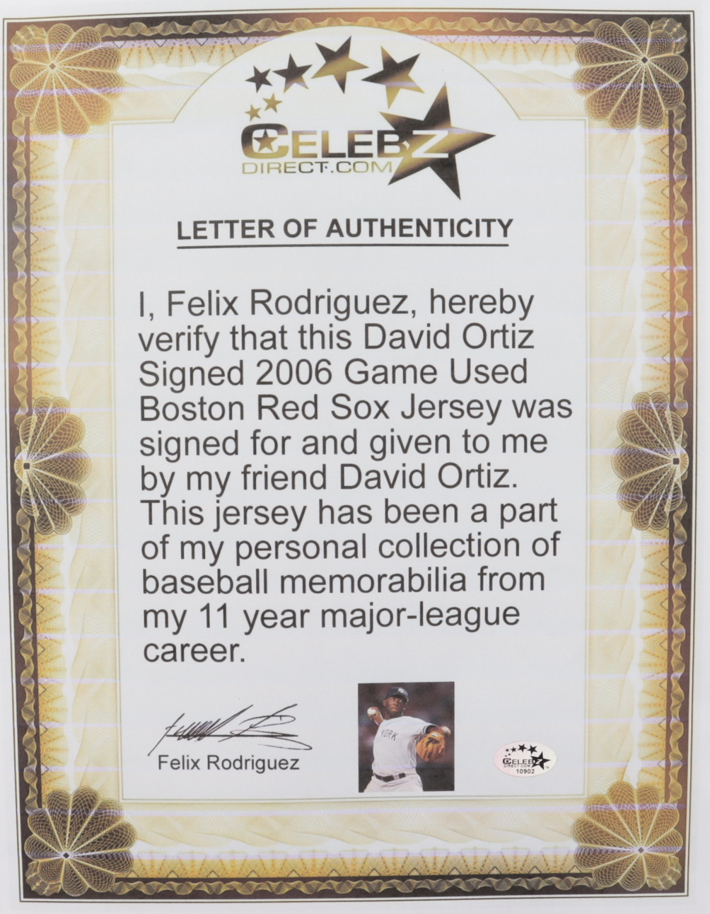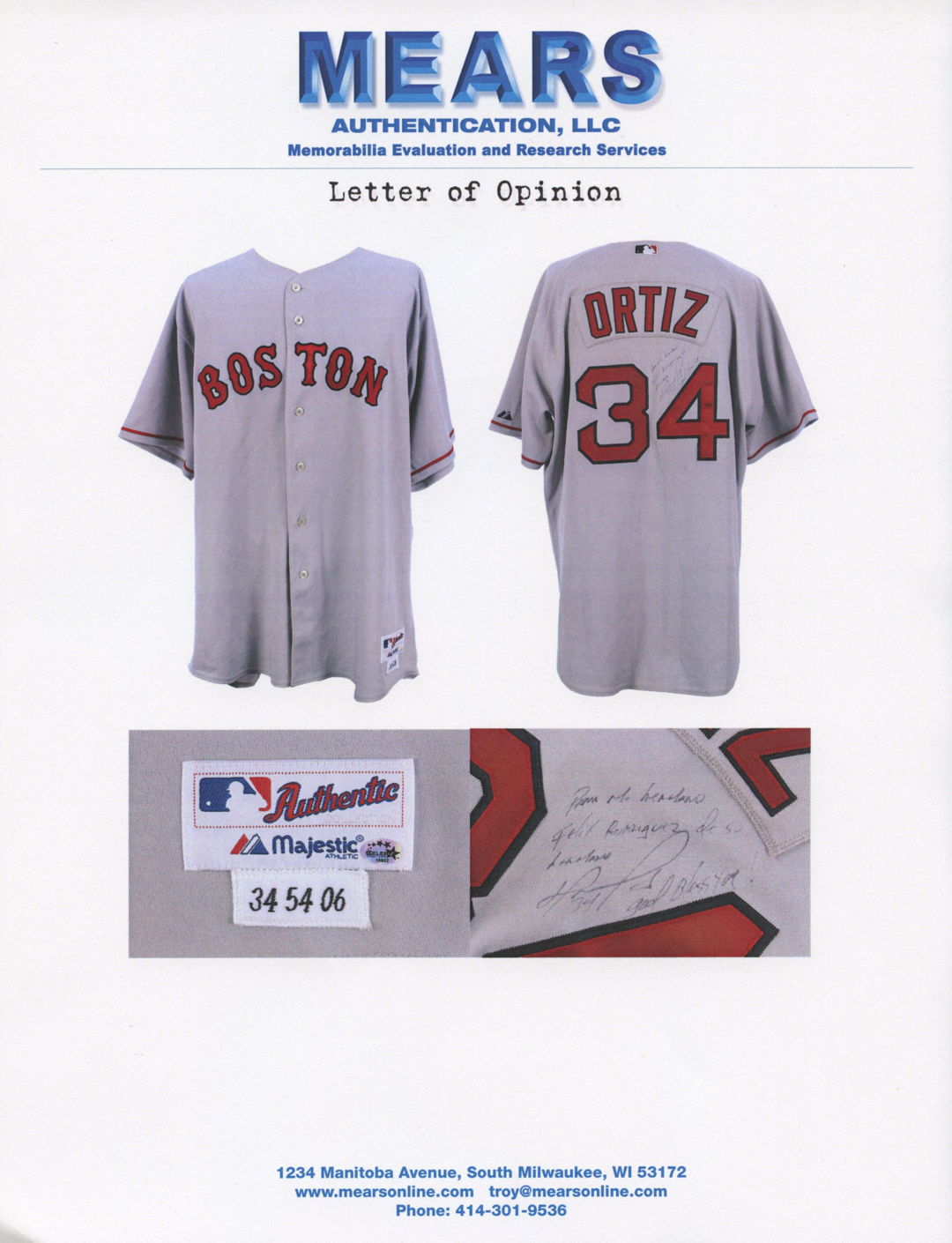 Majestic on-field game-used jersey. Everything sewn on, size XL. Hand-signed by David Ortiz (Boston Red Sox). Jersey has been game-worn by Ortiz during the 2006 season. Please note, the jersey has been personalized in Spanish to Felix Rodriguez. The jersey has been graded (A10) by Mears for game use.