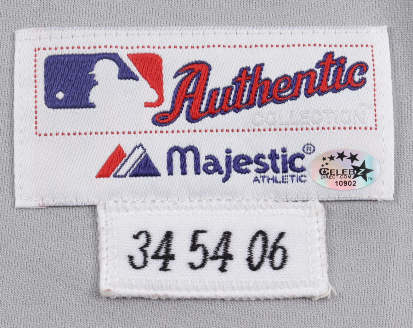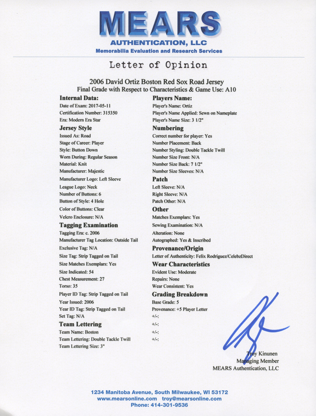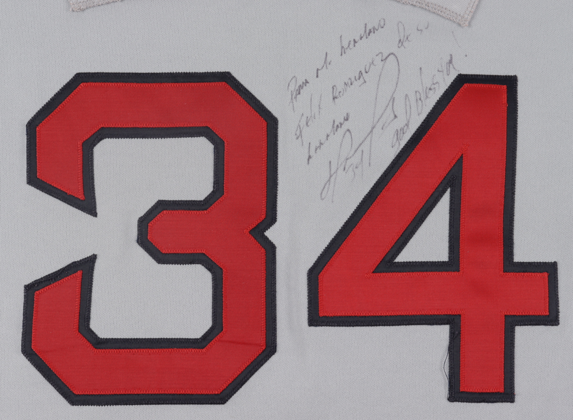 Majestic on-field game-used jersey. Everything sewn on, size XL. Hand-signed by David Ortiz (Boston Red Sox). Jersey has been game-worn by Ortiz during the 2006 season. Please note, the jersey has been personalized in Spanish to Felix Rodriguez. The jersey has been graded (A10) by Mears for game use.