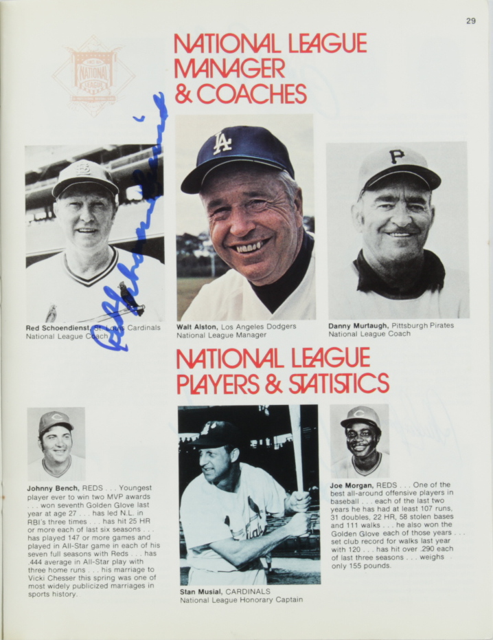 MLB 1975 All-Star Game Program has been hand-signed on the cover by (10) Pete Rose, Lou Brock, Rollie Fingers, Dave Conception, Rod Carew, Reggie Smith, George Scott, Tug McGraw, Fred Lynn and Red Schoendienst. Please note, Program has signs of wear. See photos for more details.