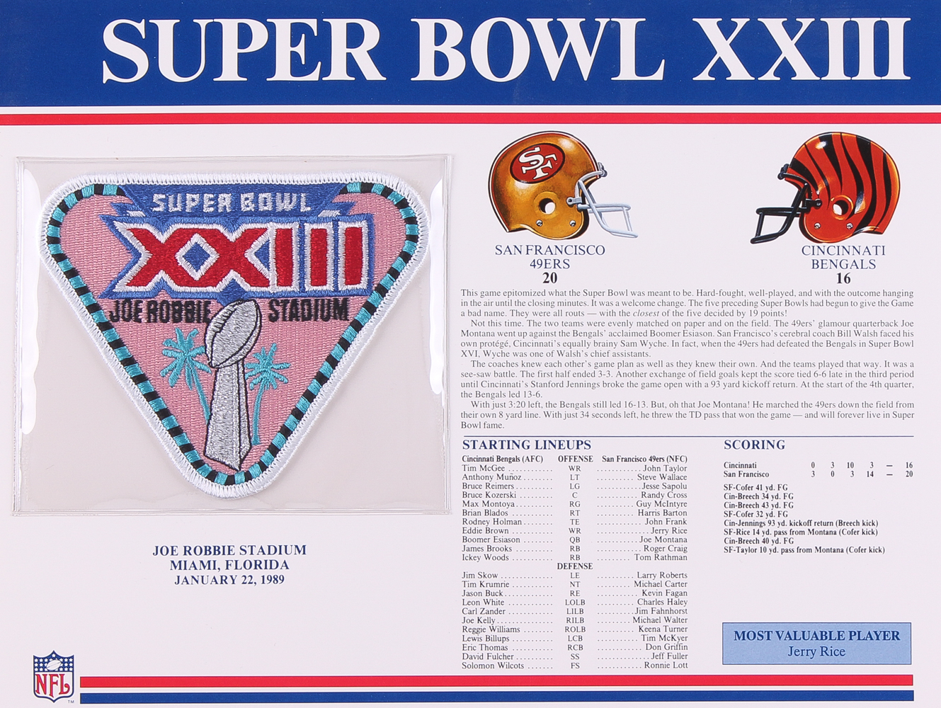Super Bowl XXIII Patch. Please see photo for details regarding the condition of the patch.
