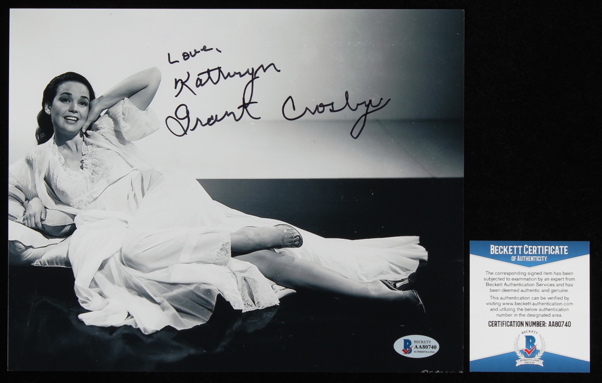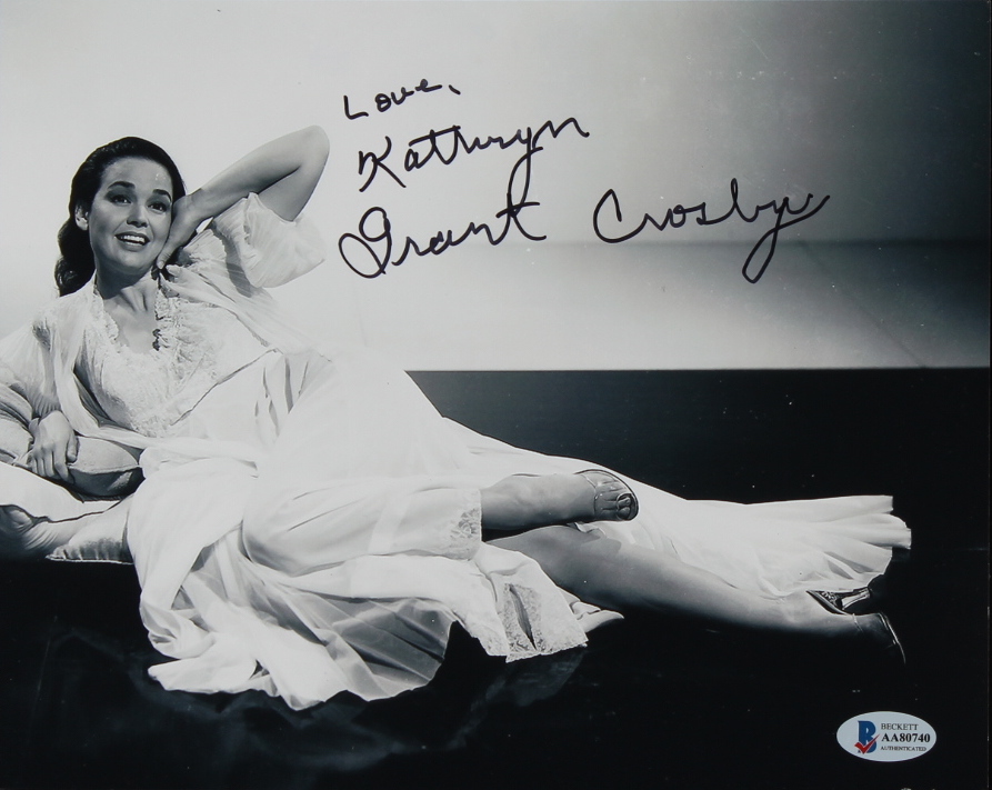 Photo measures 8" x 10" in size and has been hand-signed and inscribed by Kathryn Grant Crosby.