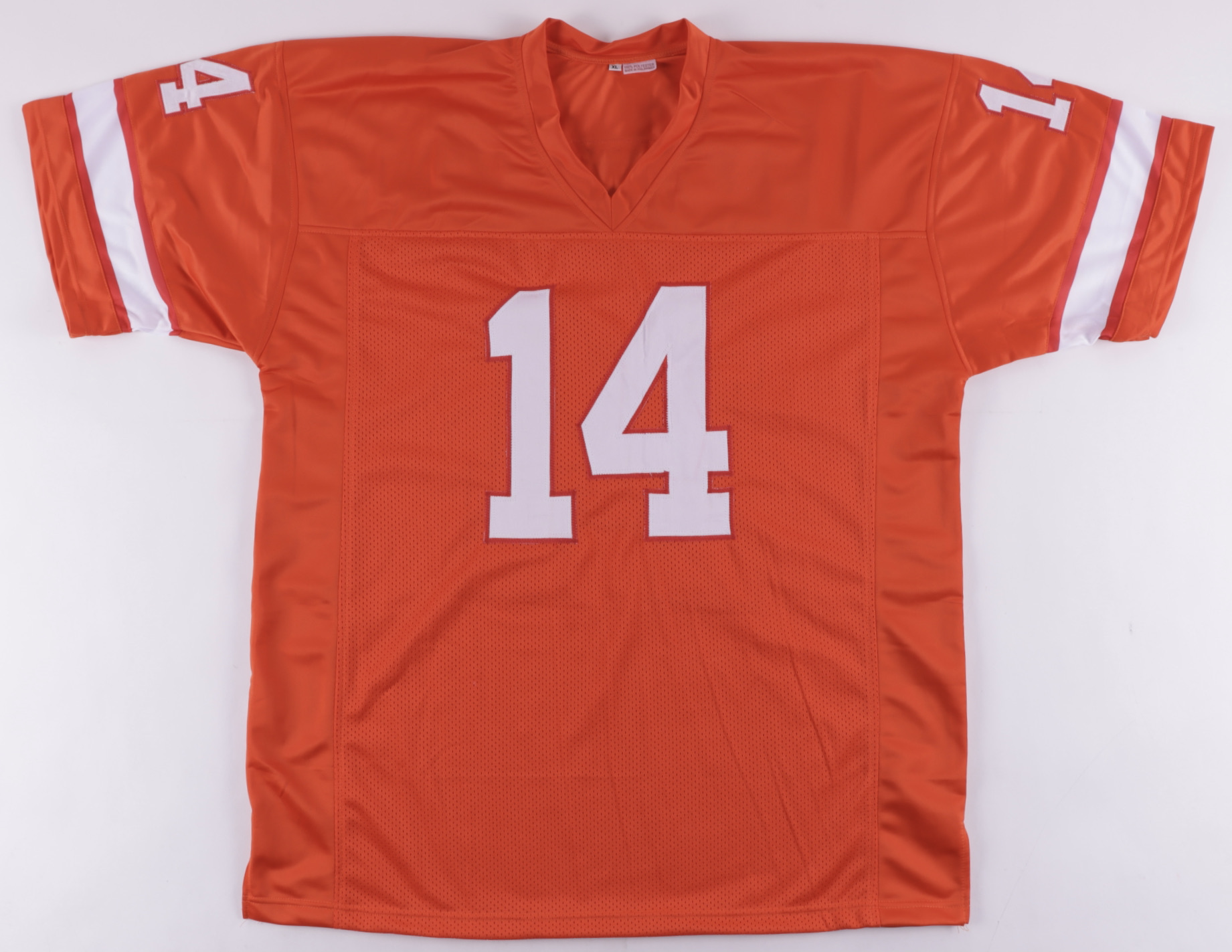 Custom on-field style jersey. Everything is sewn on, size XL. Has been hand-signed by Vinny Testaverde.