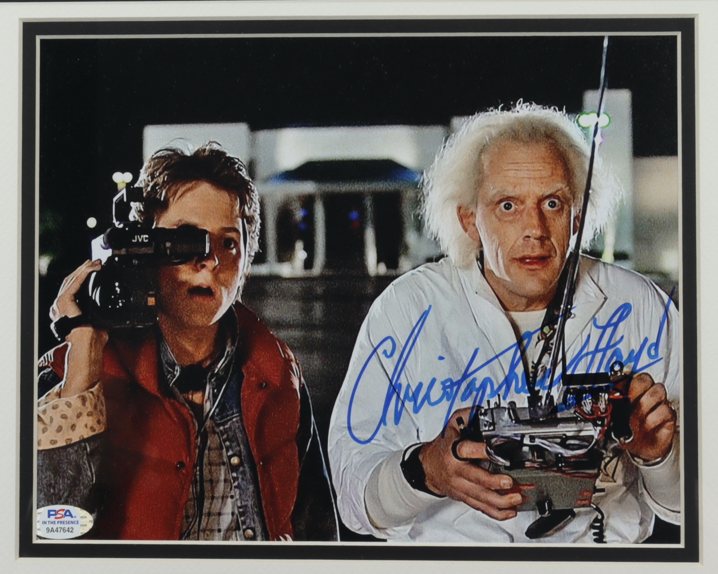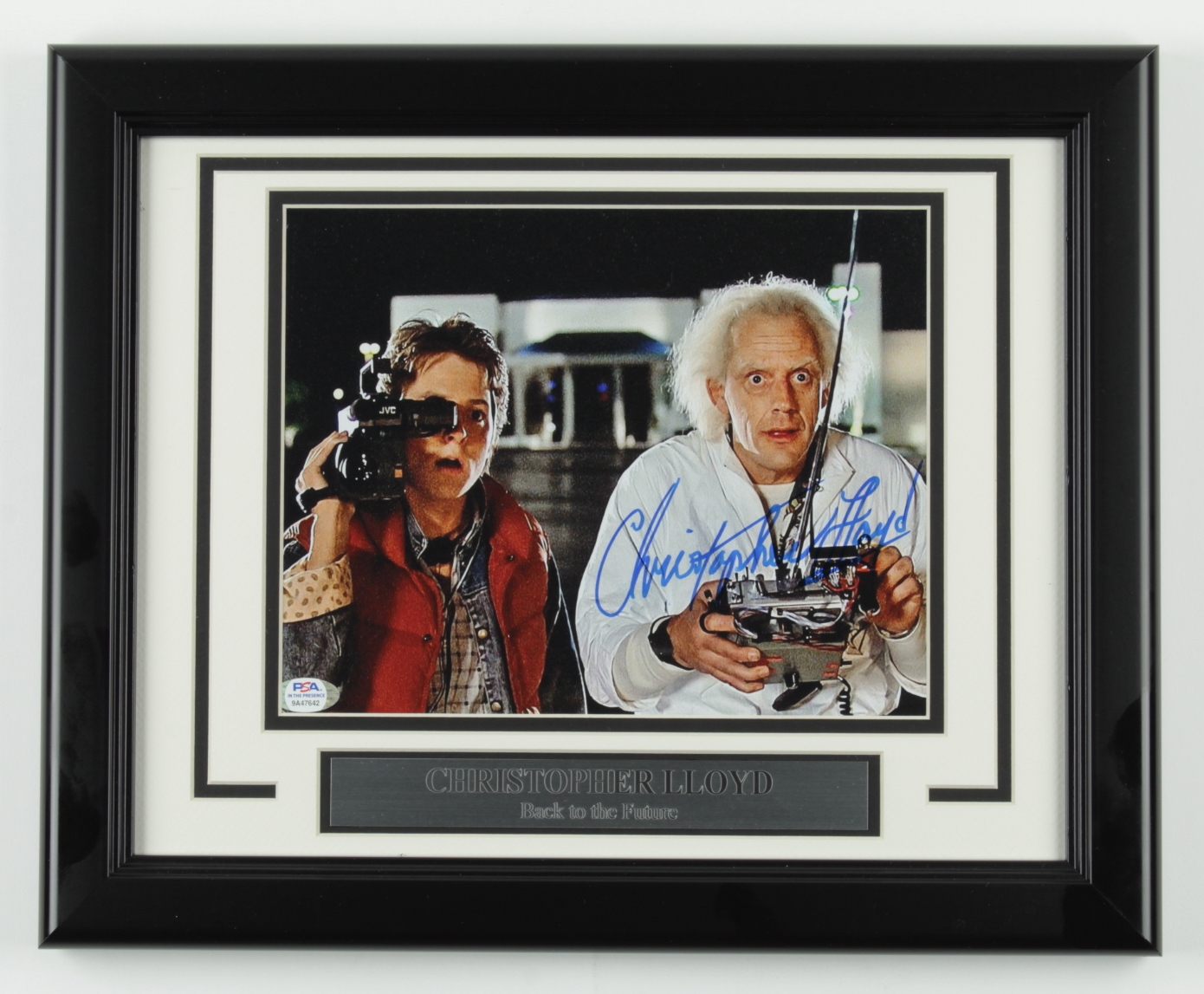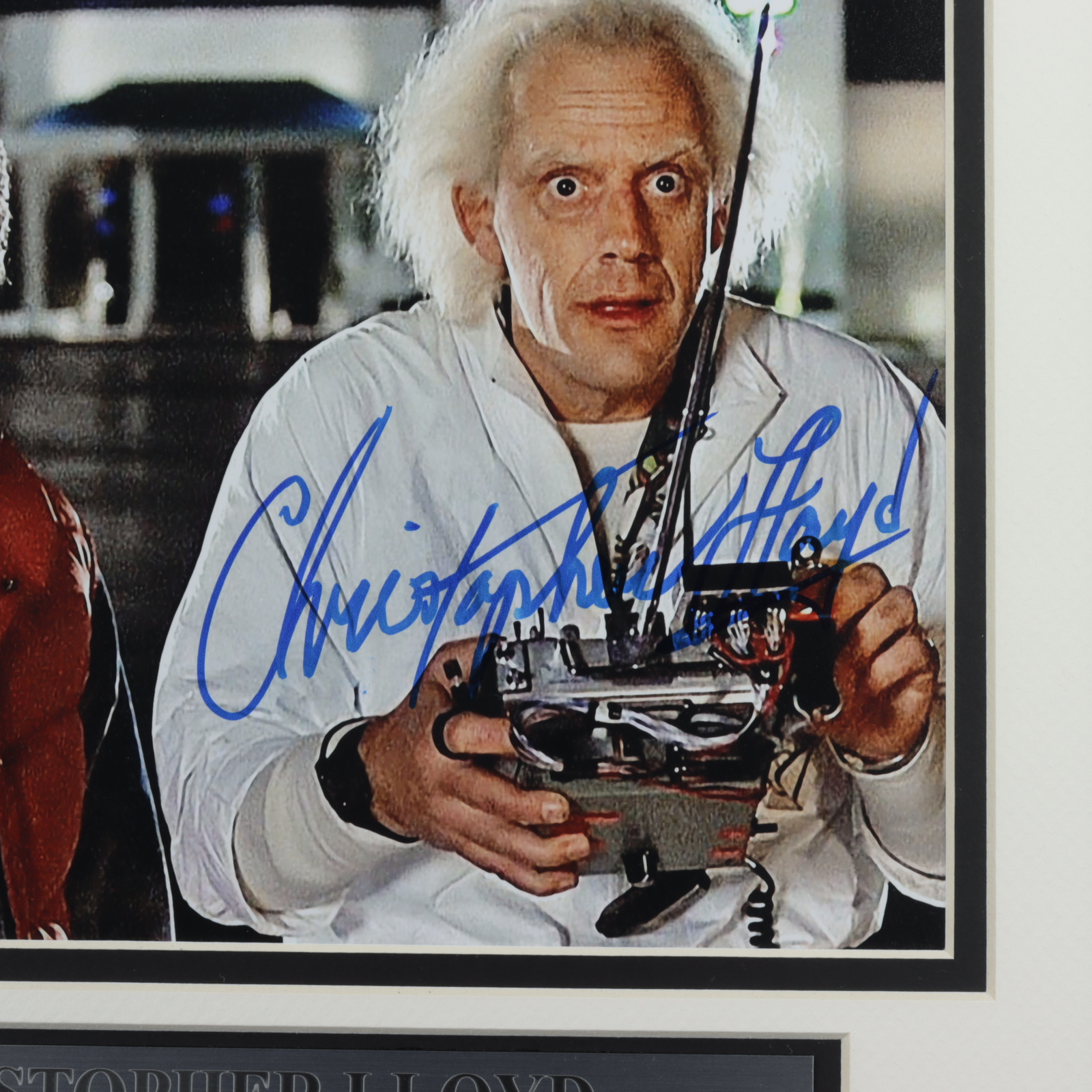 Custom frame measures 13.25" x 16.25" in size and features a photo that has been hand-signed by Christopher Lloyd (Emmett "Doc" Brown).