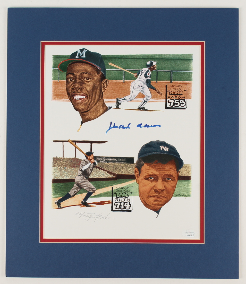 Custom matted photo display measures 15" x 17.5" in size and has been hand-signed by Hank Aaron (D. 2021, Milwaukee Brewers, HOF). Please note, display has been hand signed by the artist and hand-numbered limited edition 565/750.