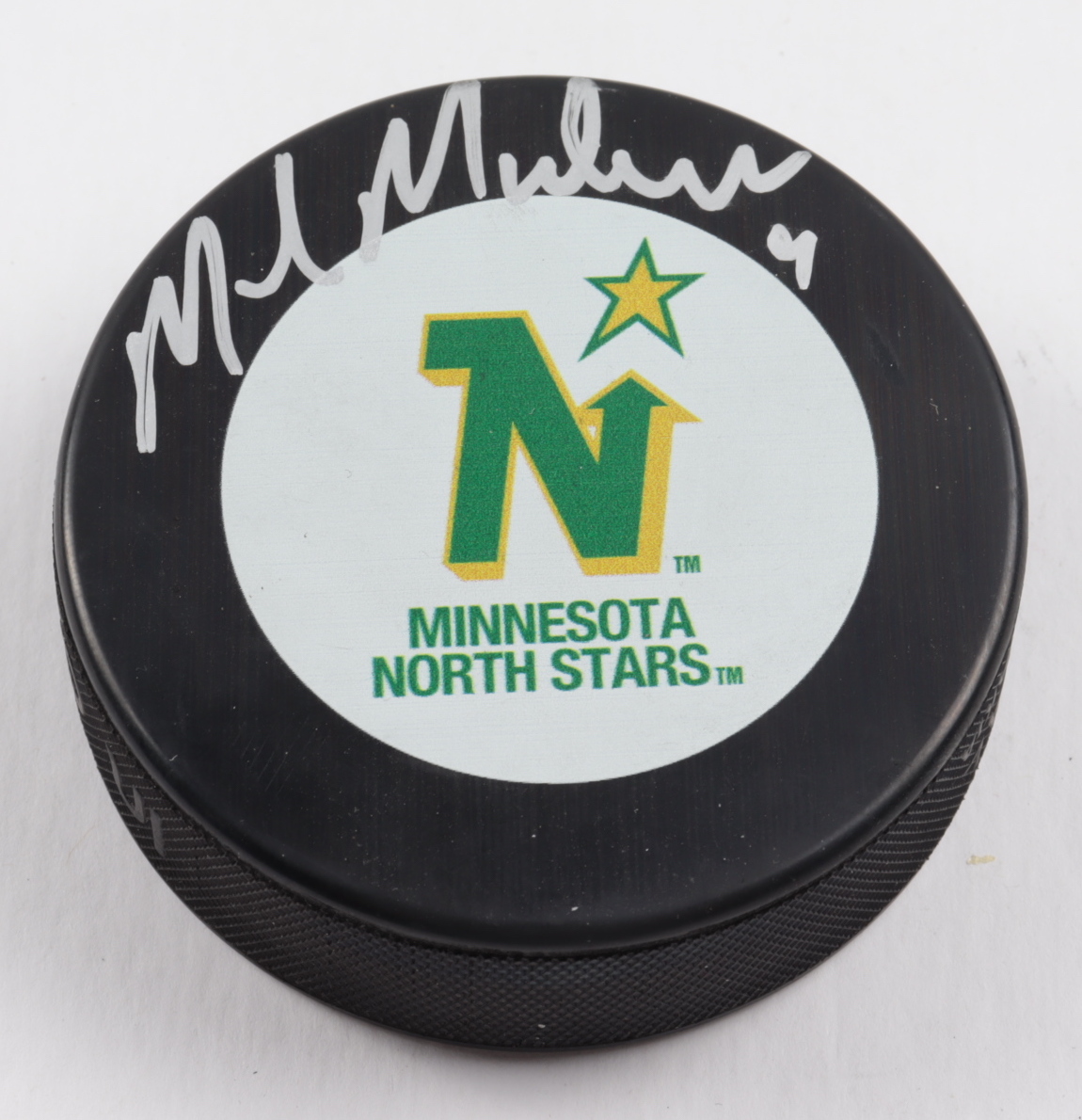 Minnesota North Stars logo hockey puck. Hand-signed by Mike Modano (HOF).