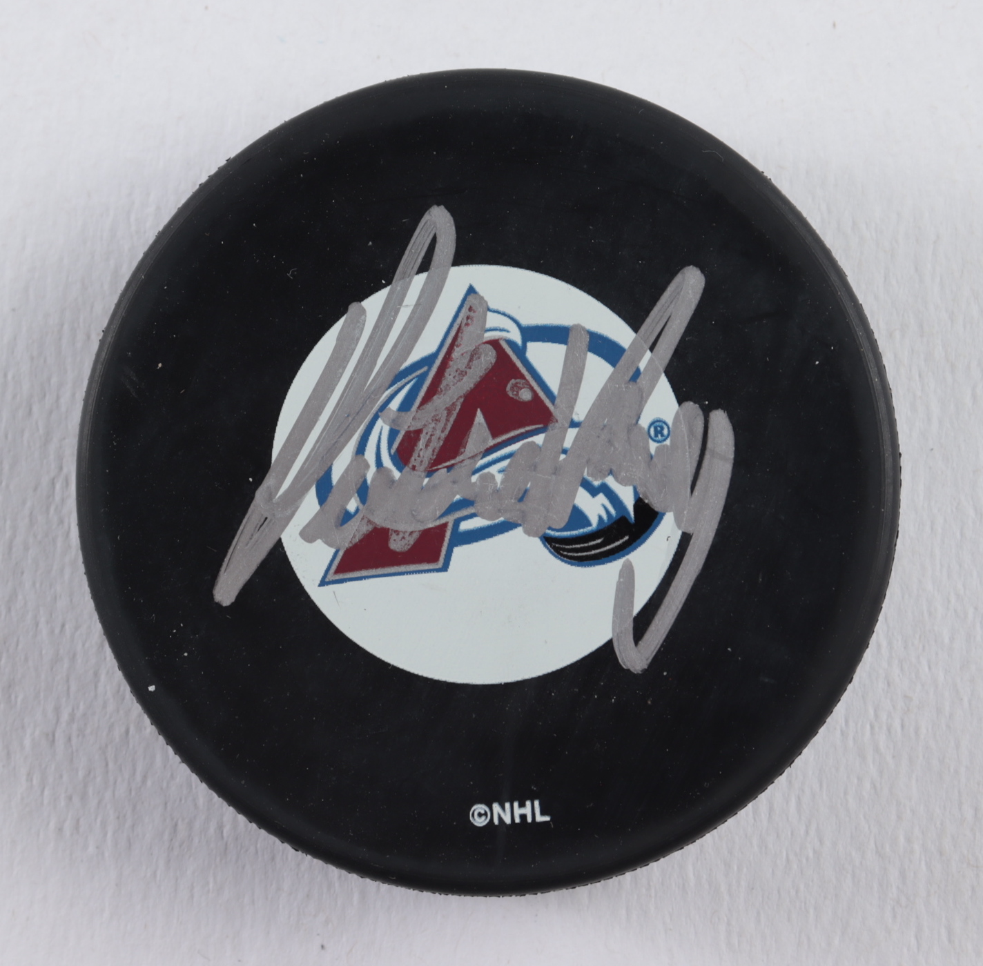 Colorado Avalanche Logo hockey puck. Hand-signed by Patrick Roy (HOF). Please note, the hologram shows minor imperfection.