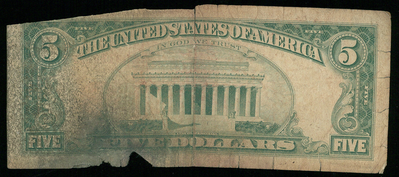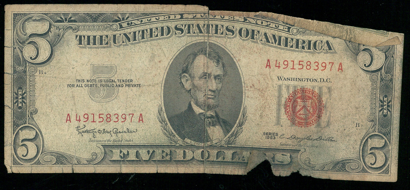 1963 Red Seal $5 Five Dollar Federal Reserve Note. Please see photos for more details regarding the condition of the currency.